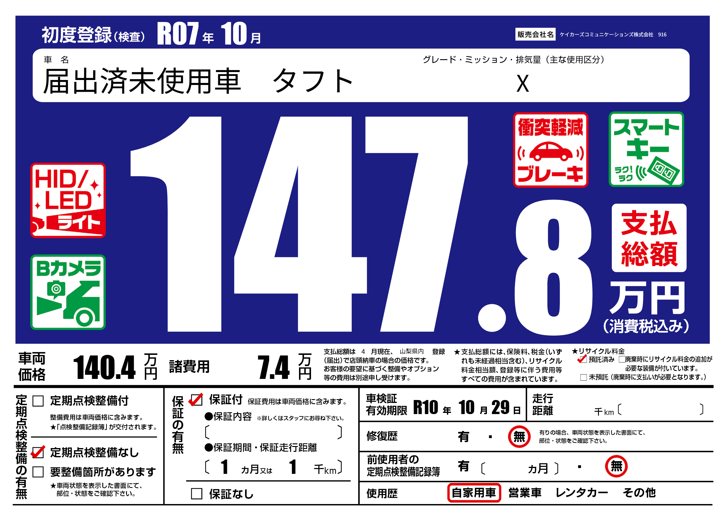 | 走行キロ | - | 初年度登録 | R07年10月 |
