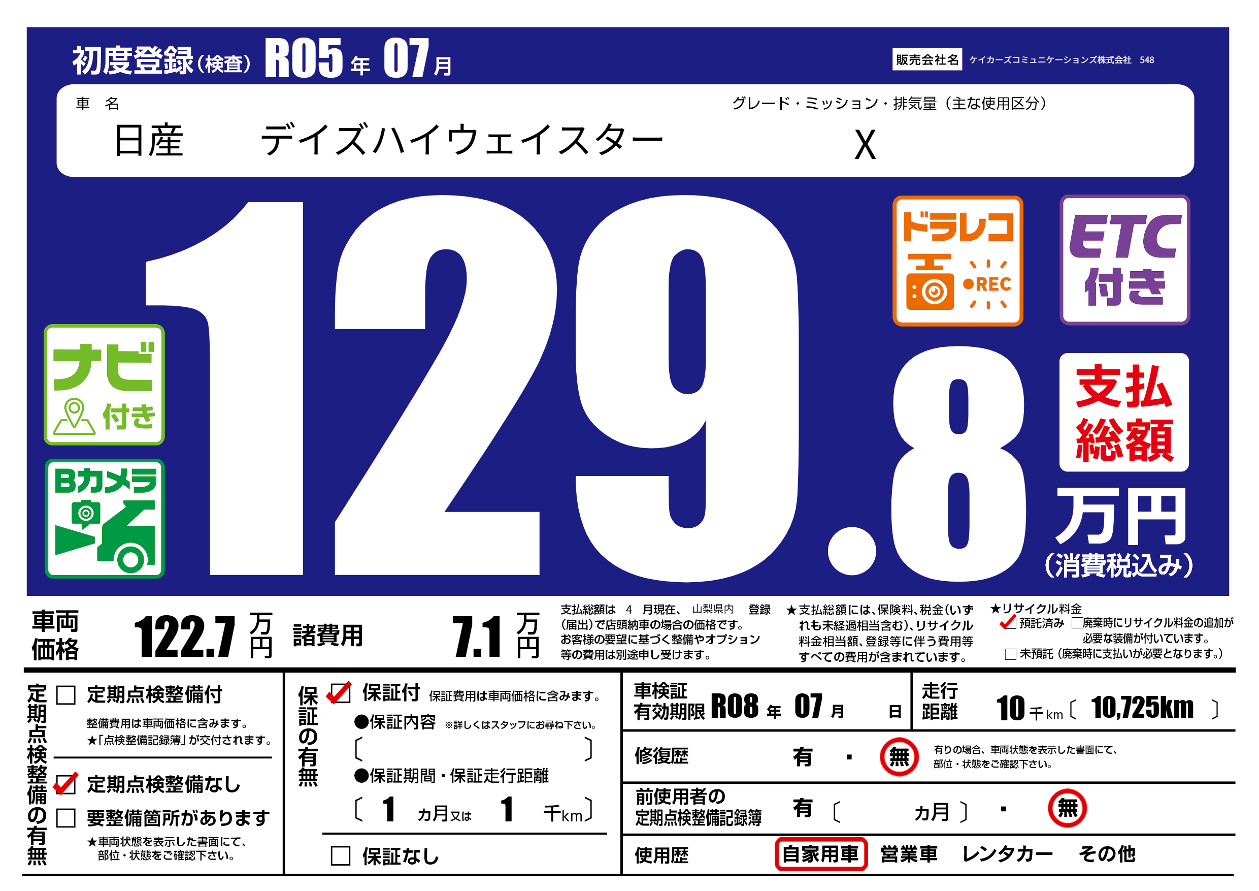 | 走行キロ | 1万km | 初年度登録 | R05年07月 |