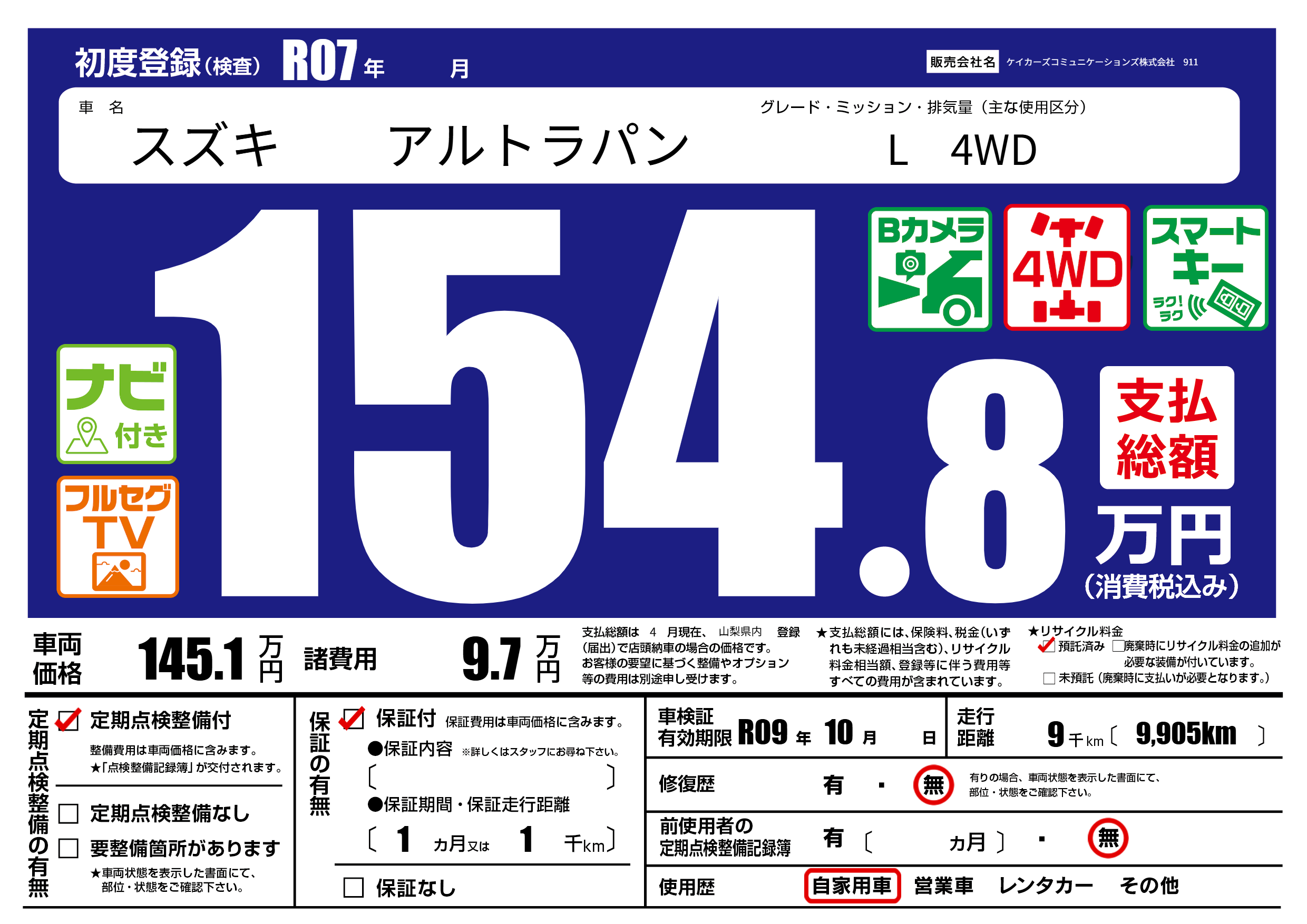 | 走行キロ | 0.9万km | 初年度登録 | R07年---月 |