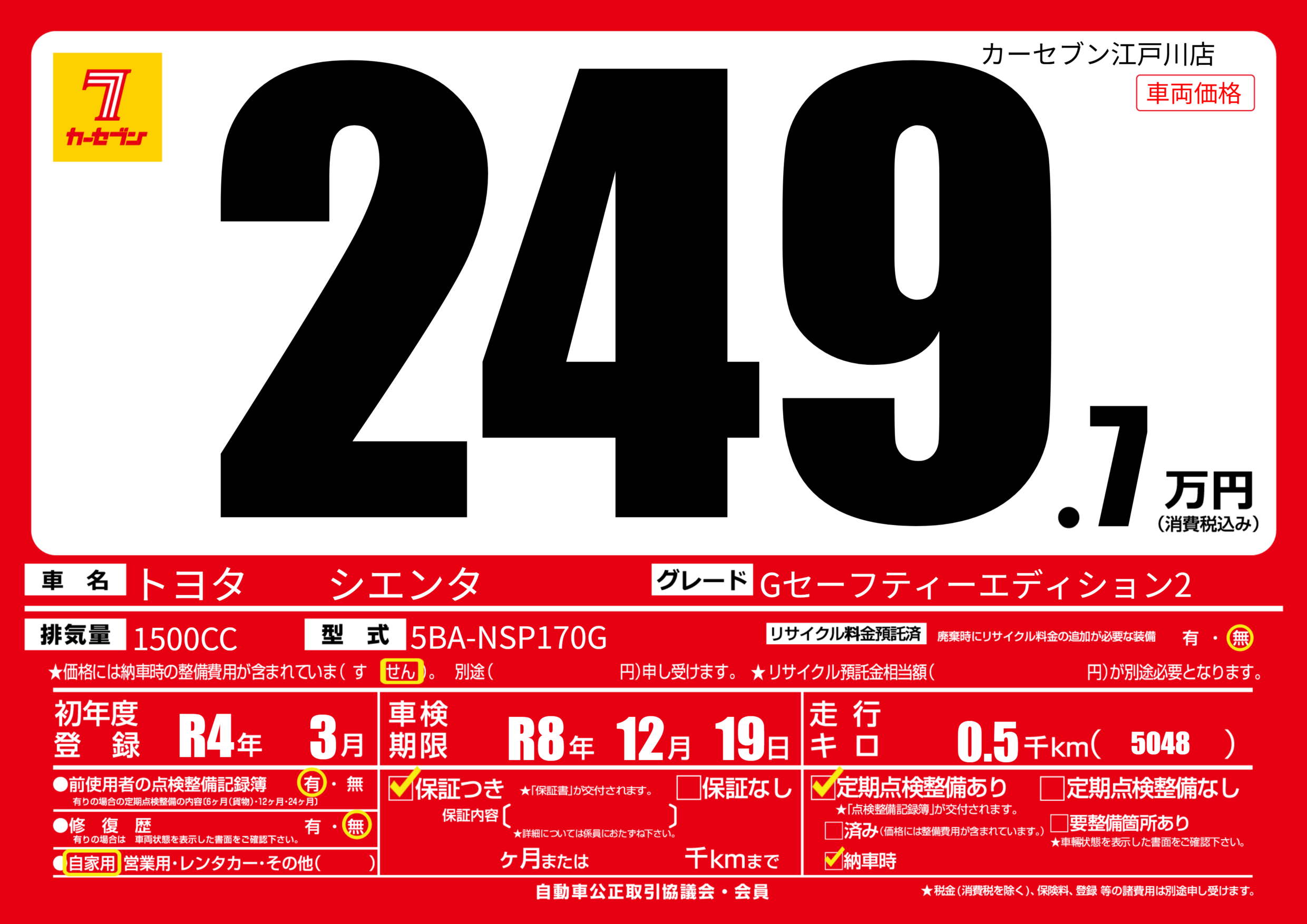 | 車名 | トヨタ シエンタ | グレード ミッション 排気量 |