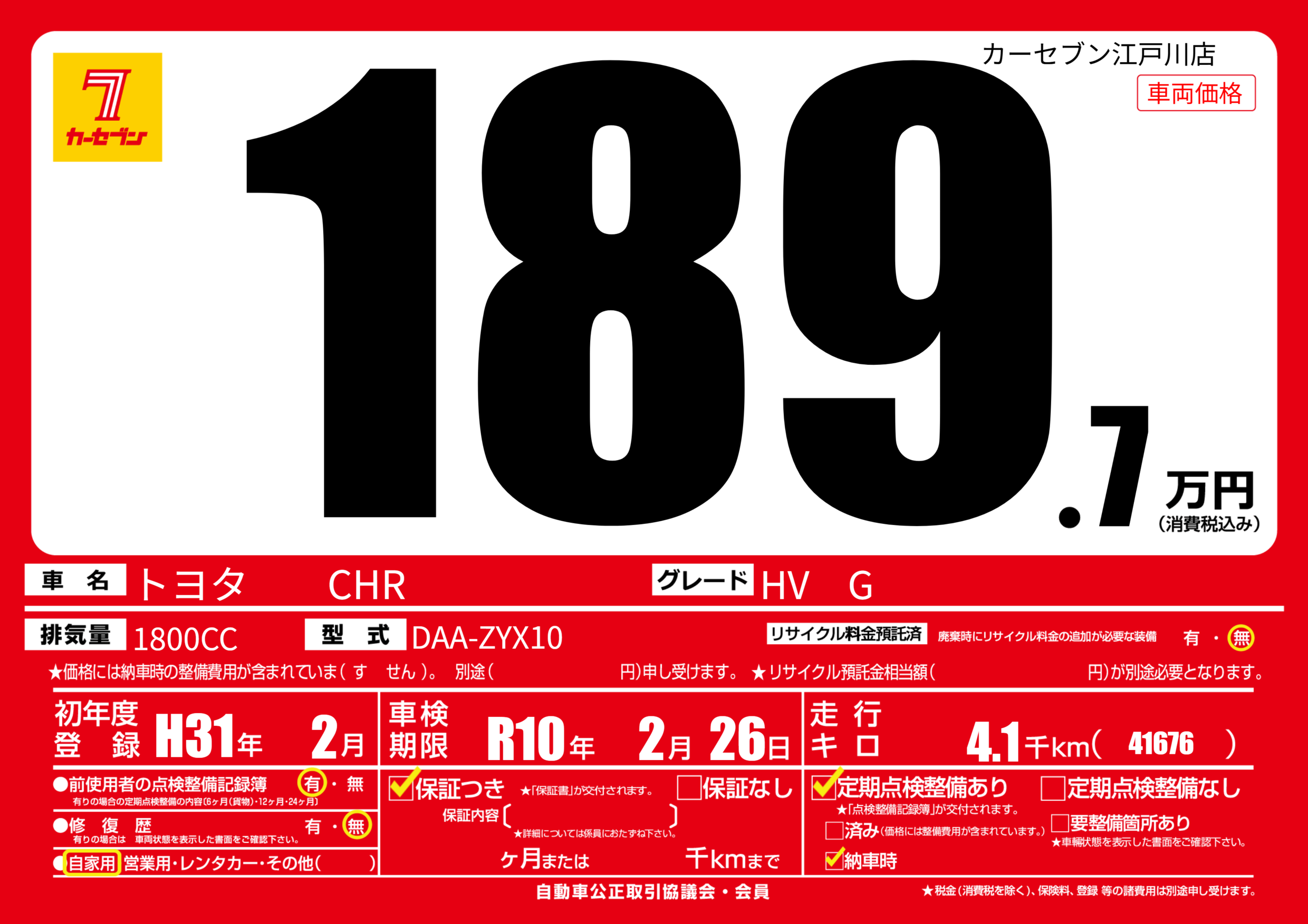 | 車名 | トヨタ CHR | グレード ミッション 排気量 |