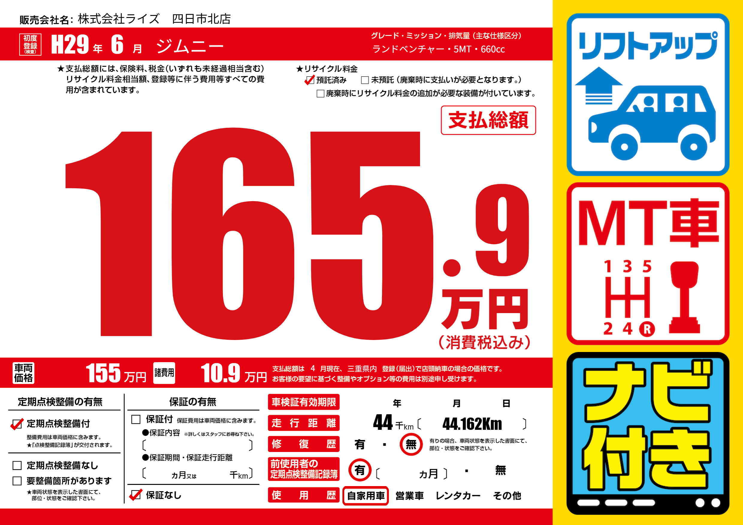 | 走行キロ | 4.4万km | 初年度登録 | H29年6月 |