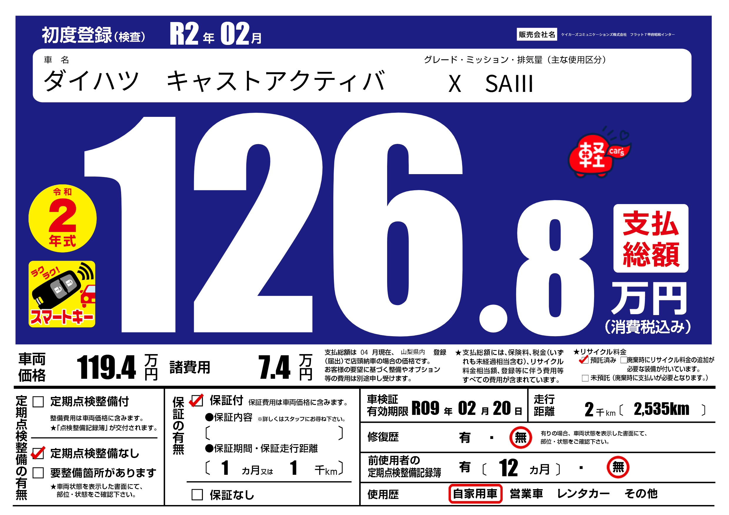 | 車名 | ダイハツ キャストアクティバ | グレード ミッション 排気量 |
