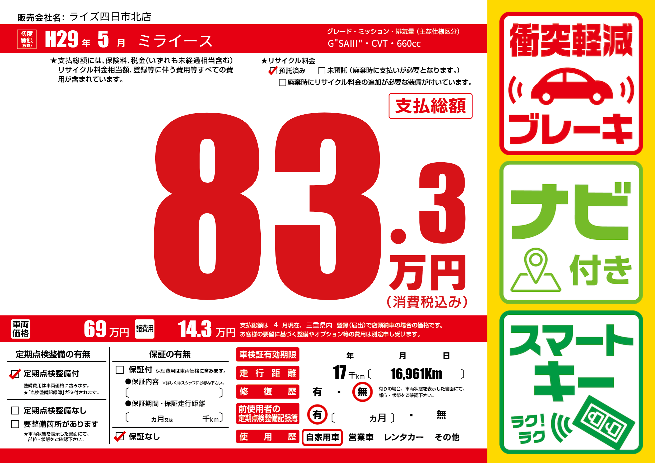 | 車名 | ミライース | グレード ミッション 排気量 |