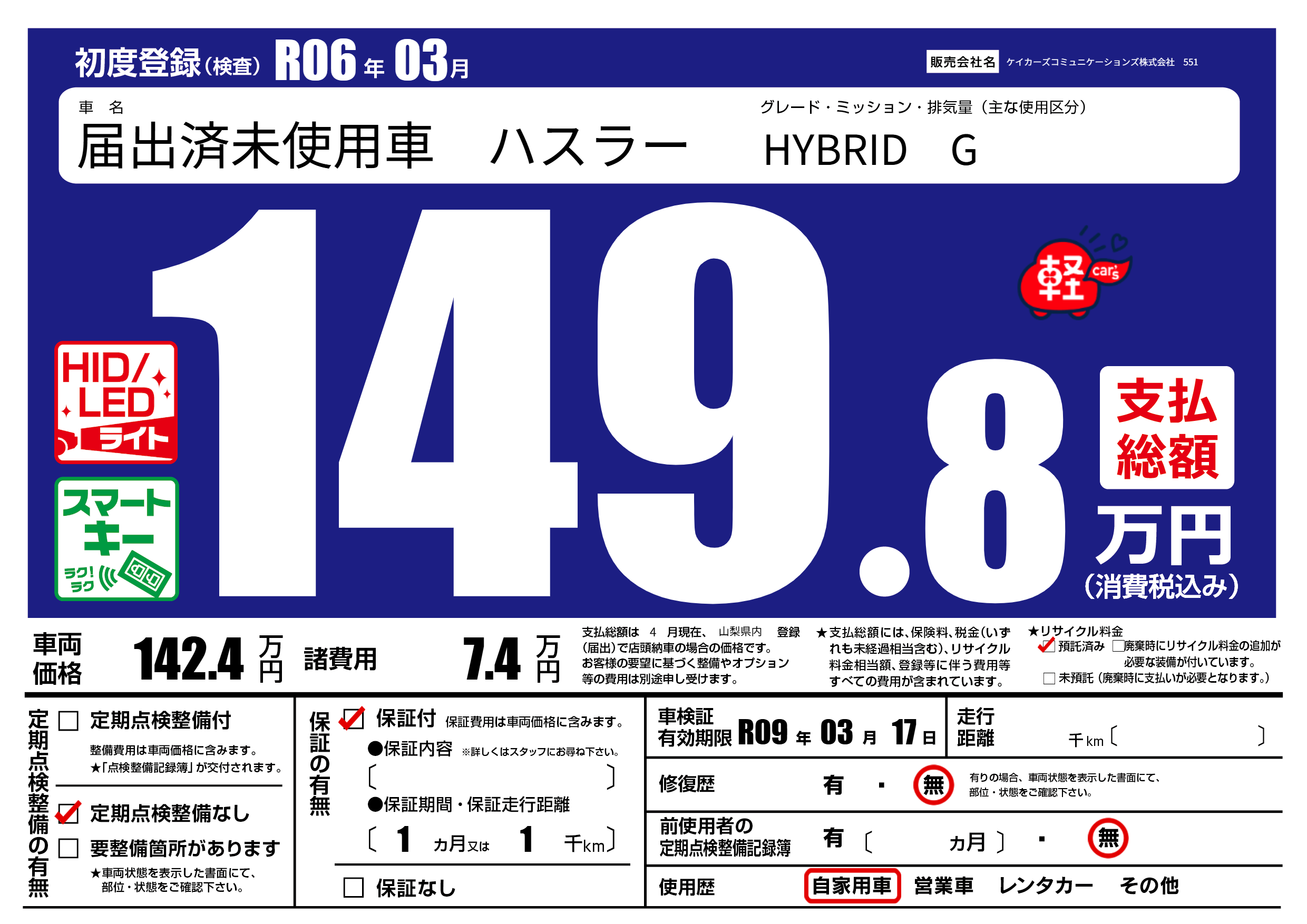| 車名 | 届出済未使用車 ハスラー | グレード ミッション 排気量 |