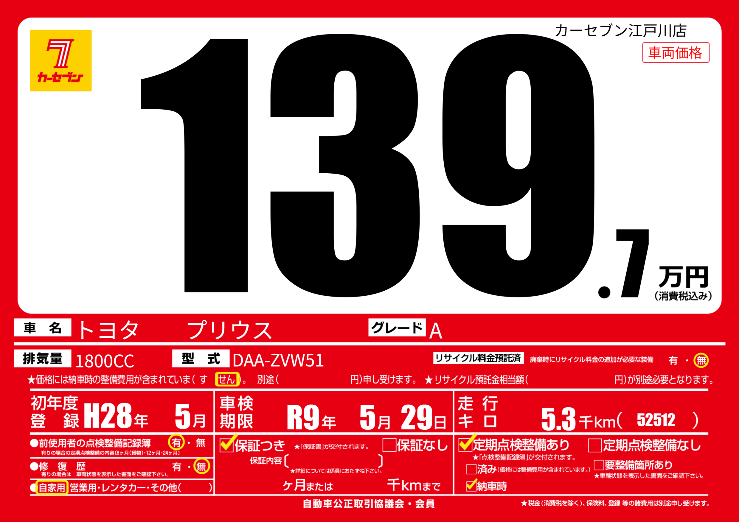 | 車名 | トヨタ プリウス | グレード ミッション 排気量 |