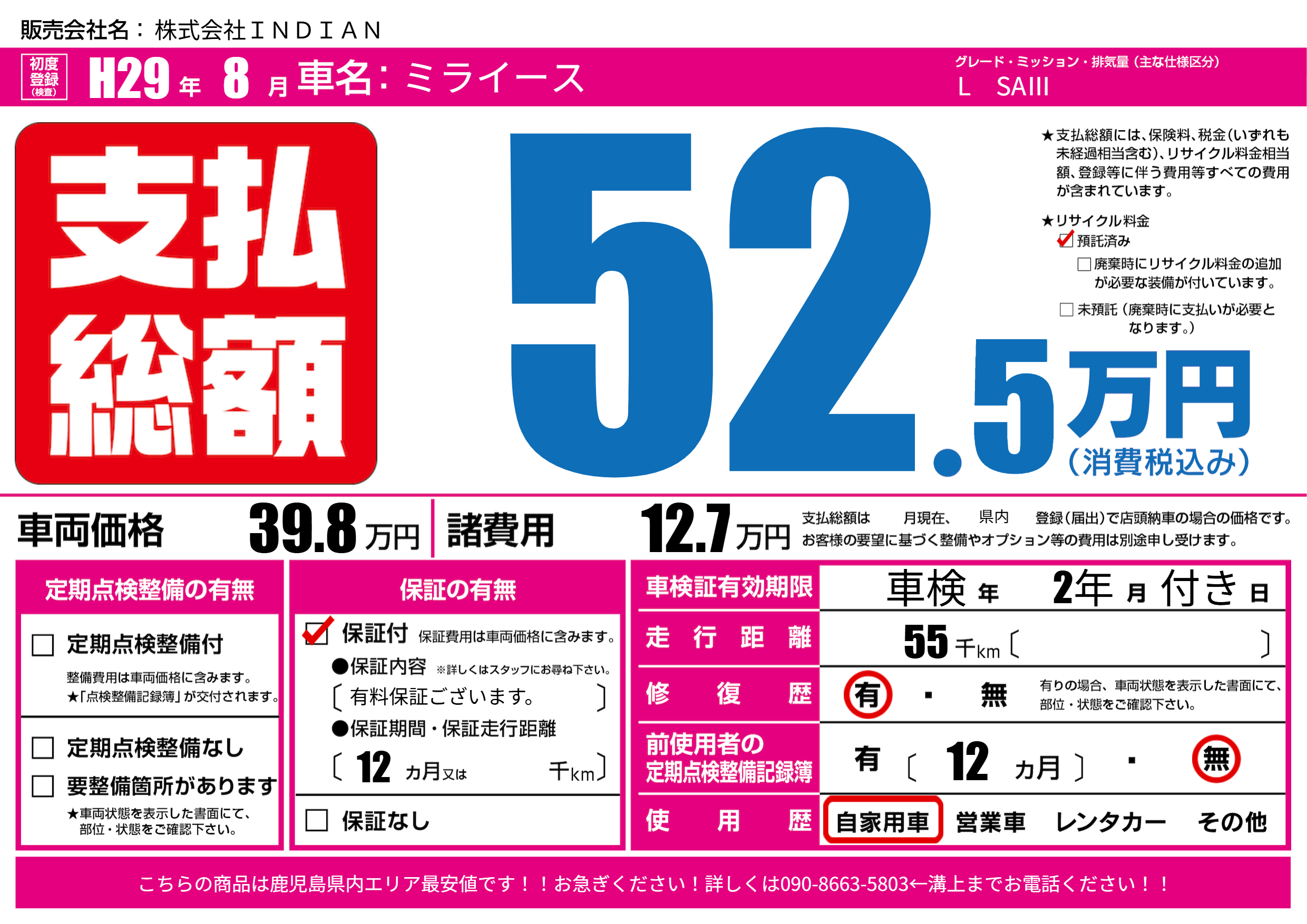 | 走行キロ | 5.5万km | 初年度登録 | H29年8月 |