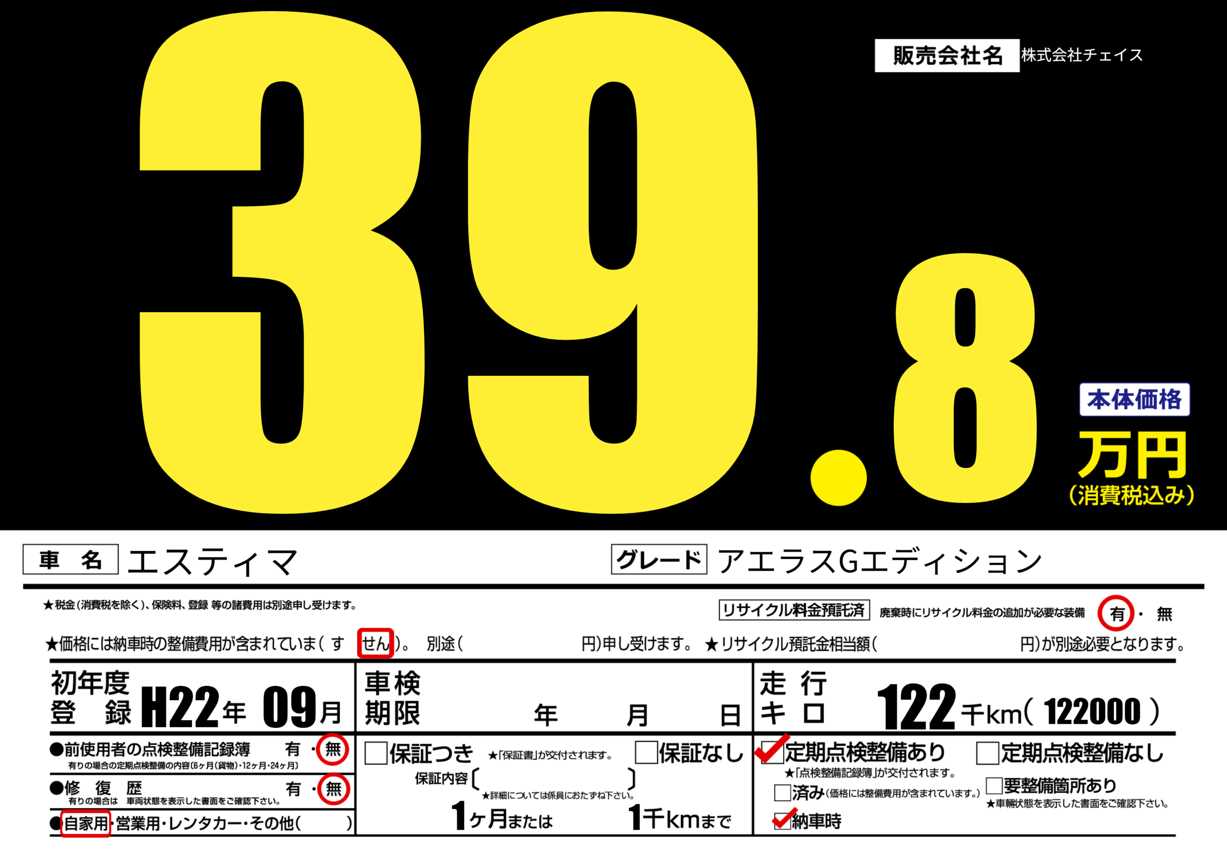 | 定期点検整備 | 定期点検整備あり 納車時あり | ||