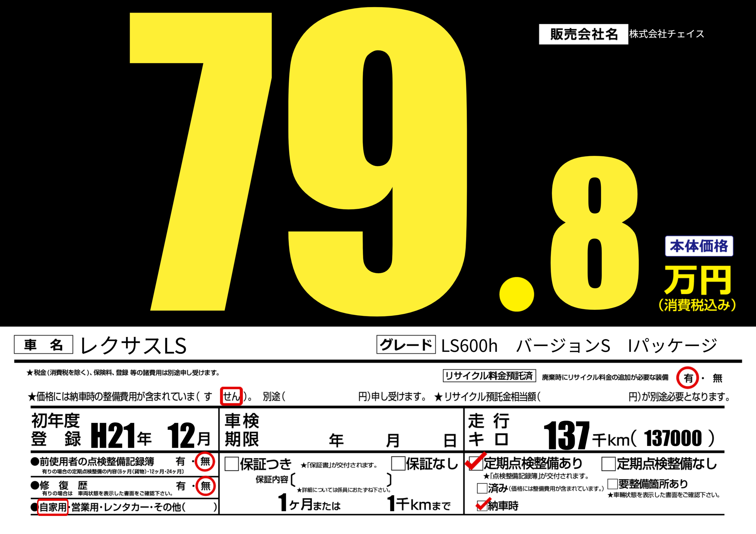 | 定期点検整備 | 定期点検整備あり 納車時あり | ||
