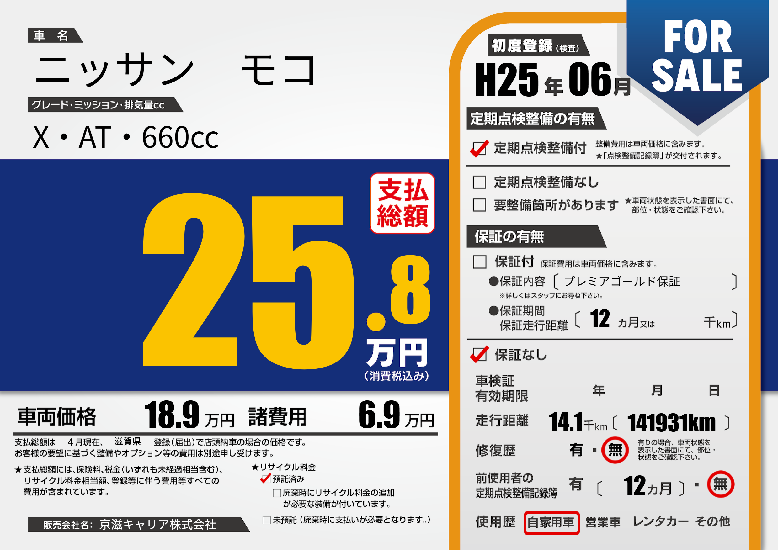 | 車名 | ニッサン モコ | グレード ミッション 排気量 |