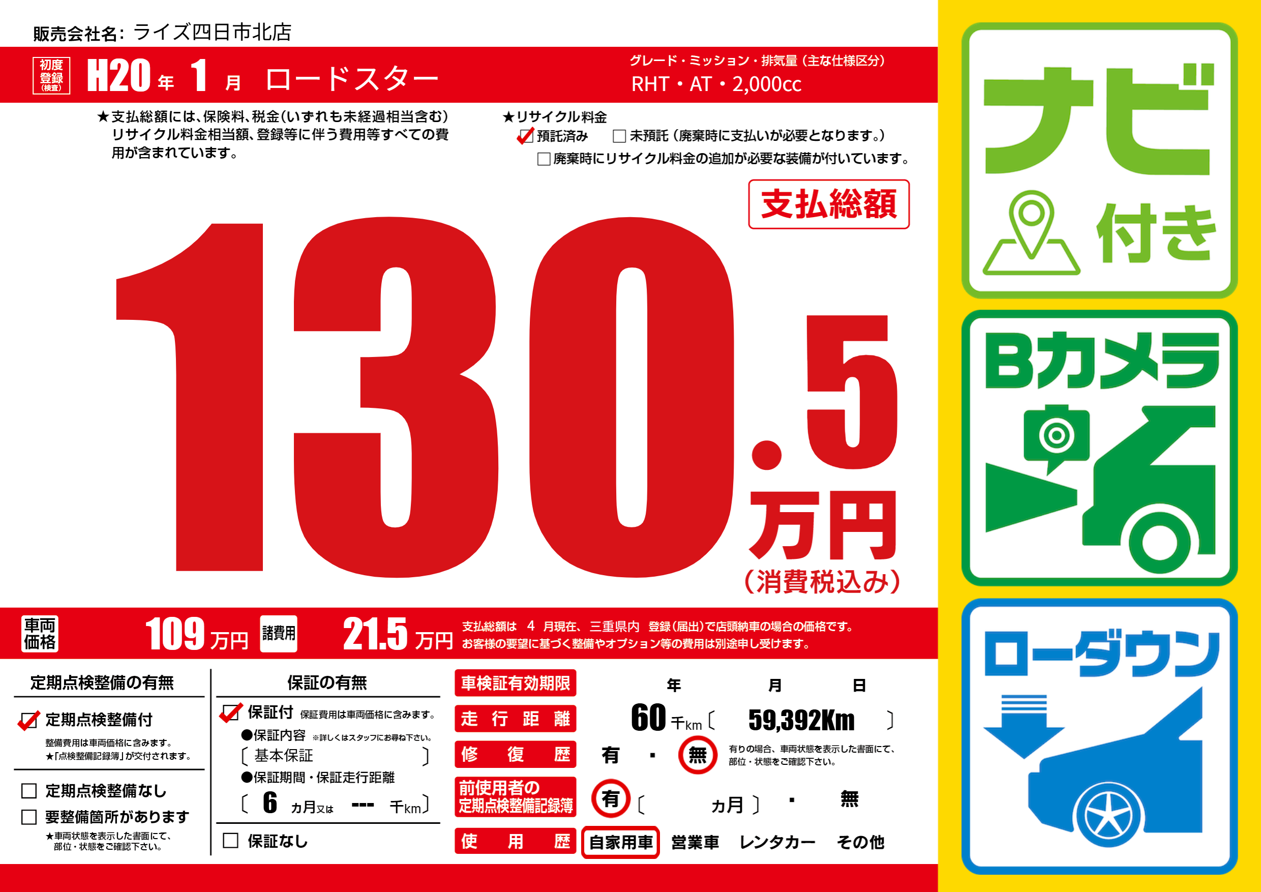 | 車名 | ロードスター | グレード ミッション 排気量 |