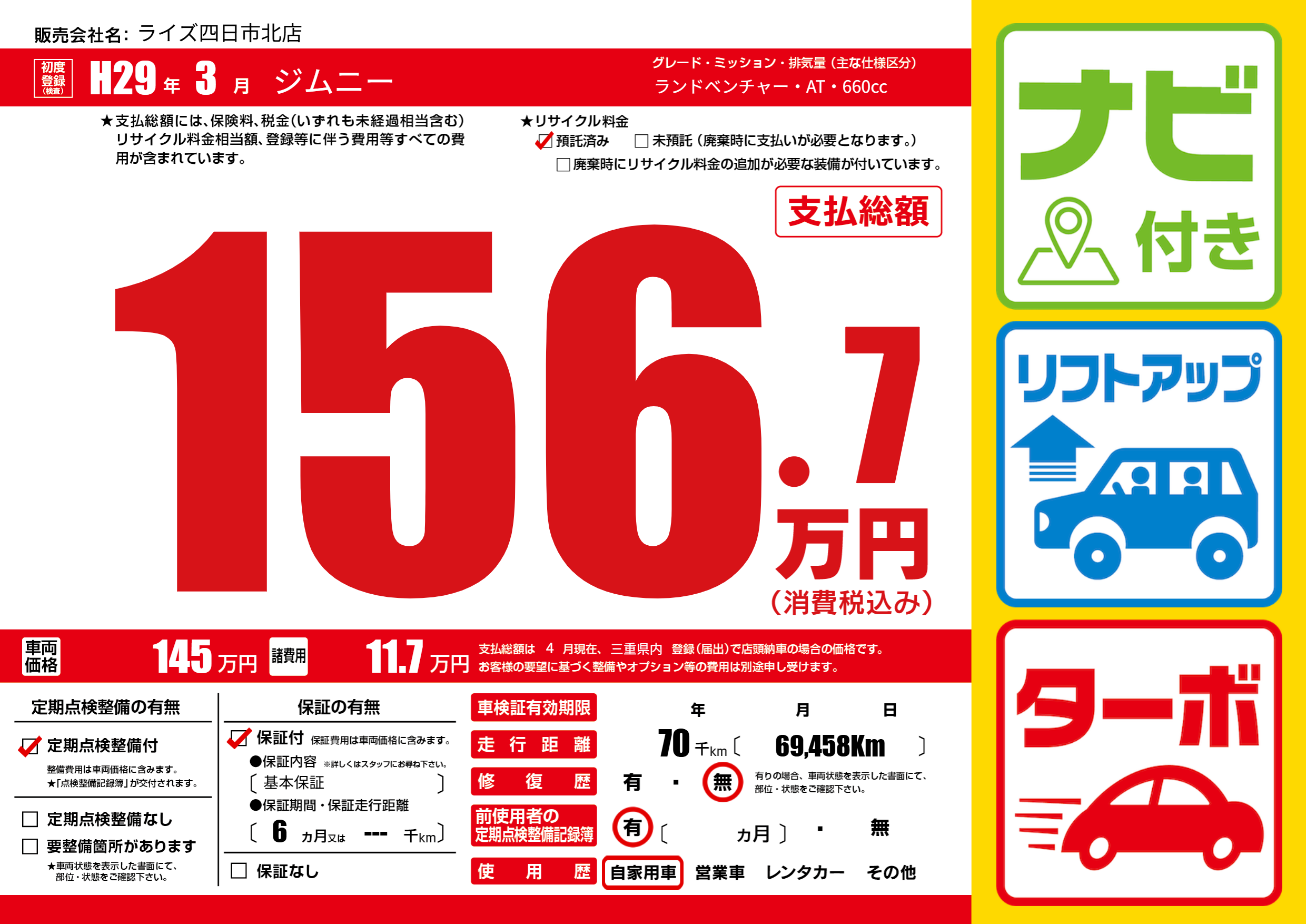 | 走行キロ | 7万km | 初年度登録 | H29年3月 |