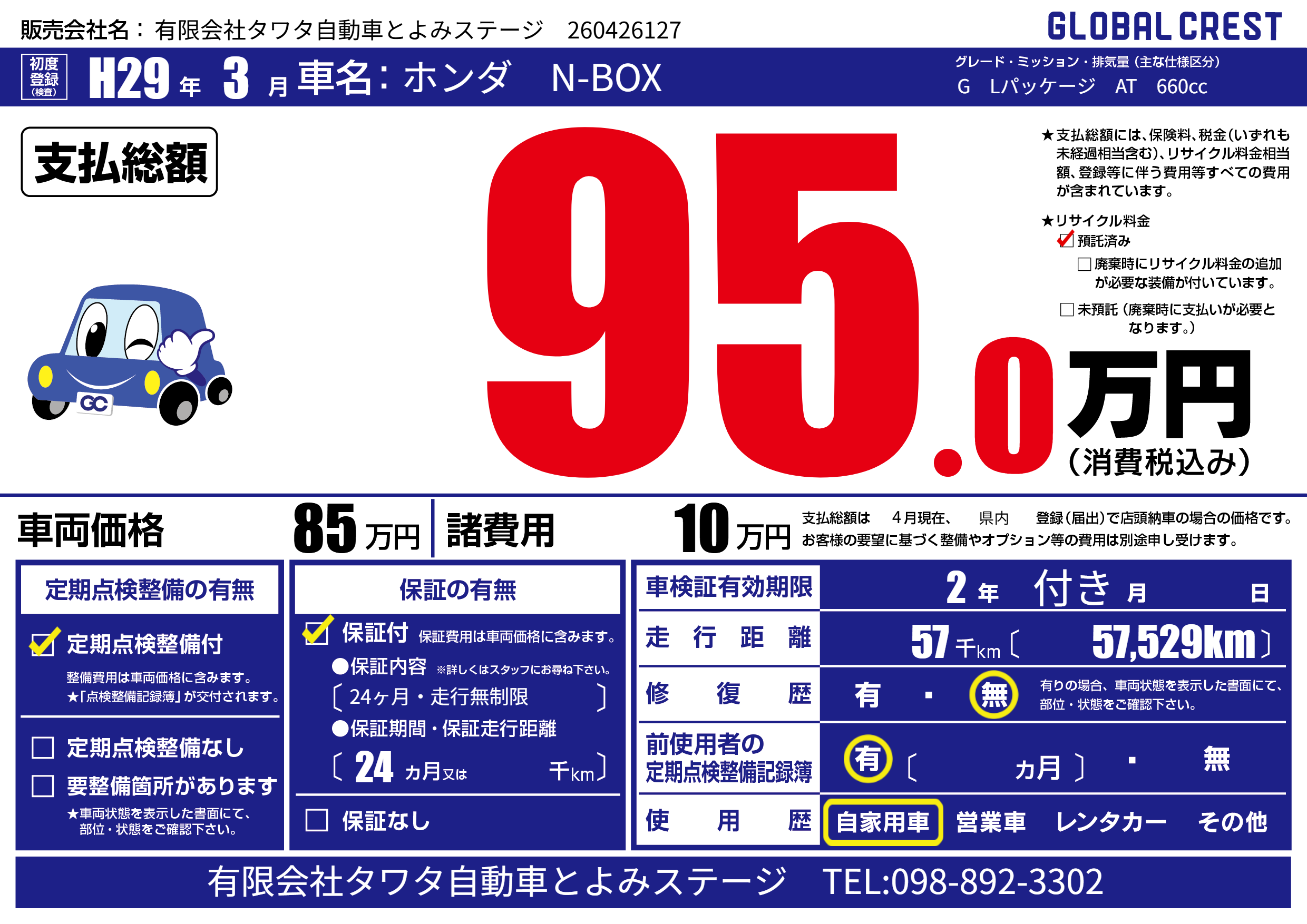 | 車名 | ホンダ N-BOX | グレード ミッション 排気量 |