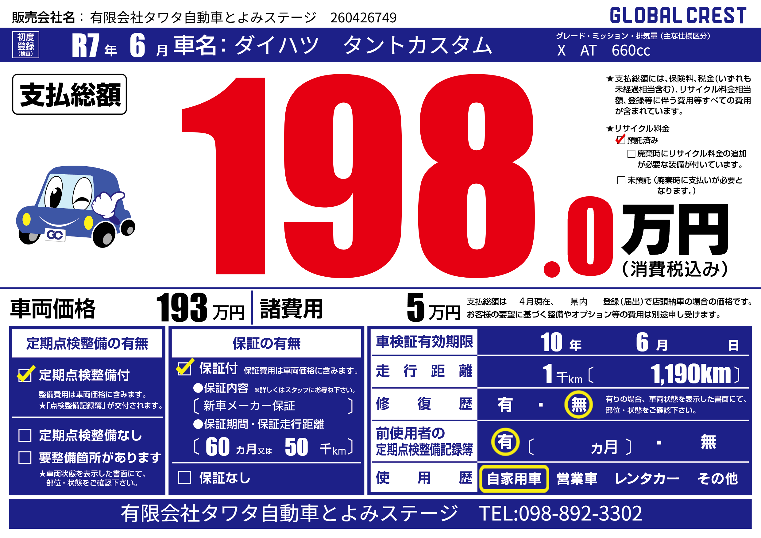 | 車名 | ダイハツ タントカスタム | グレード ミッション 排気量 |
