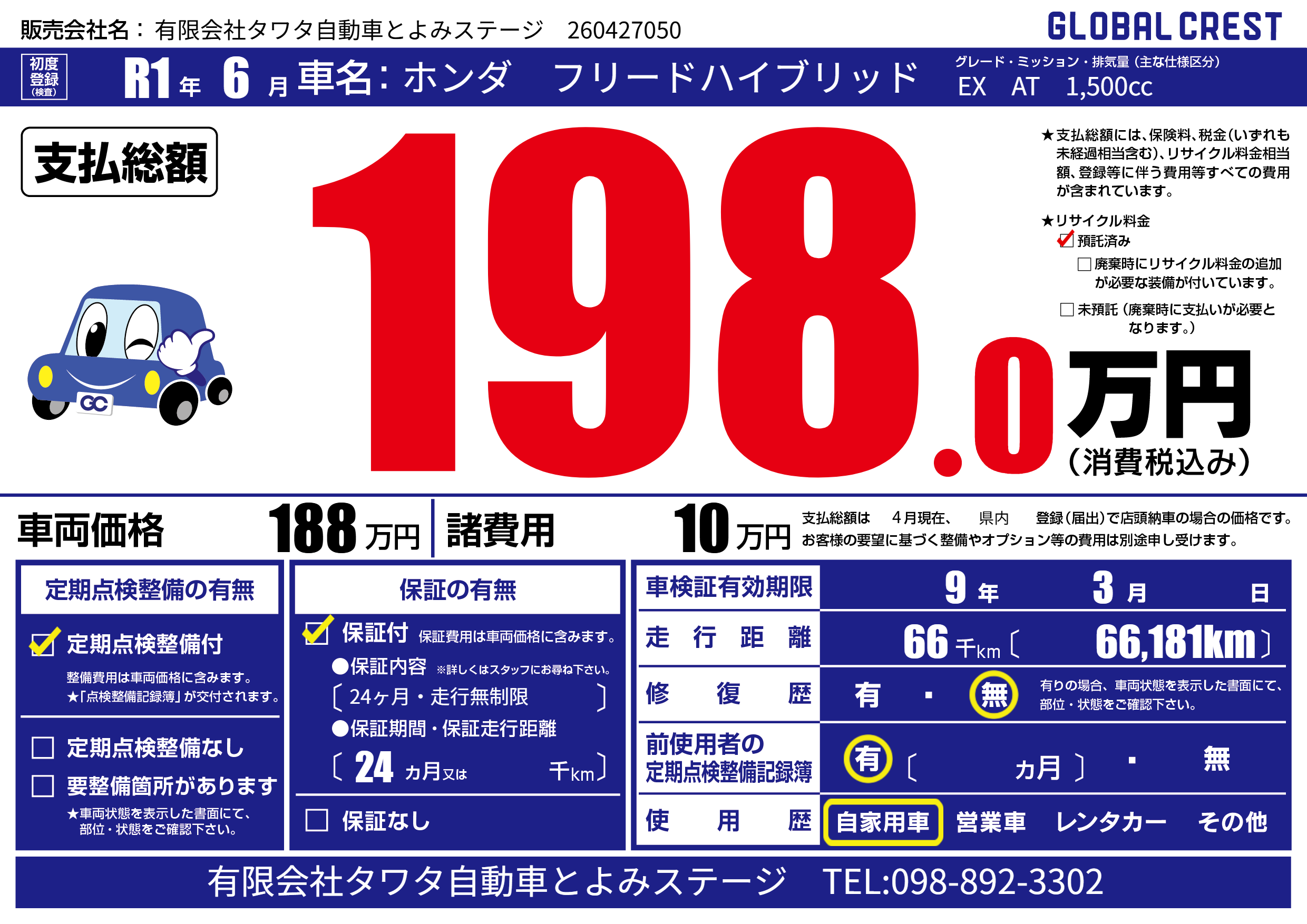 | 車名 | ホンダ フリードハイブリッド | グレード ミッション 排気量 |