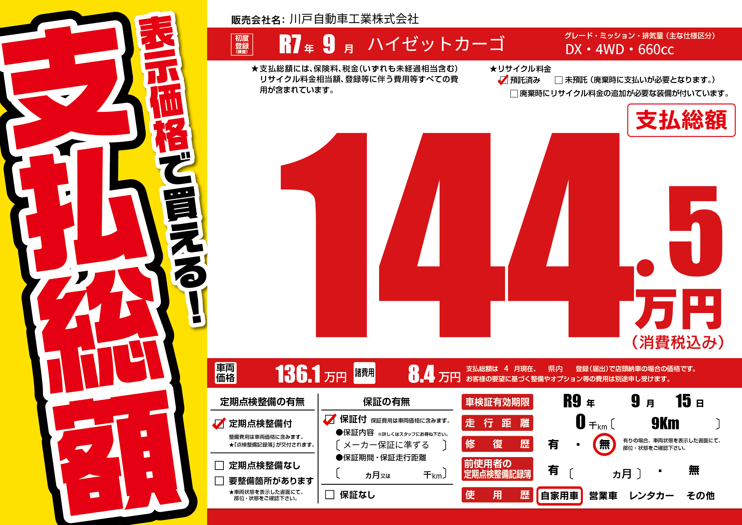 なし | 車検制限 | R9年9月15月 |