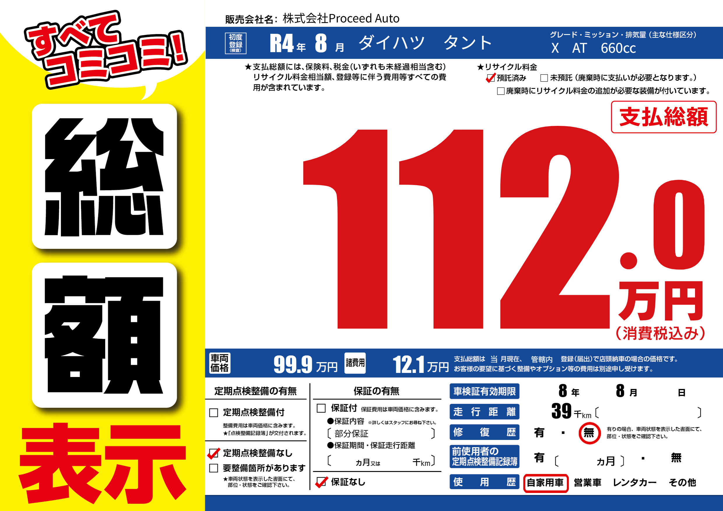 | 車名 | ダイハツ タント | グレード ミッション 排気量 |