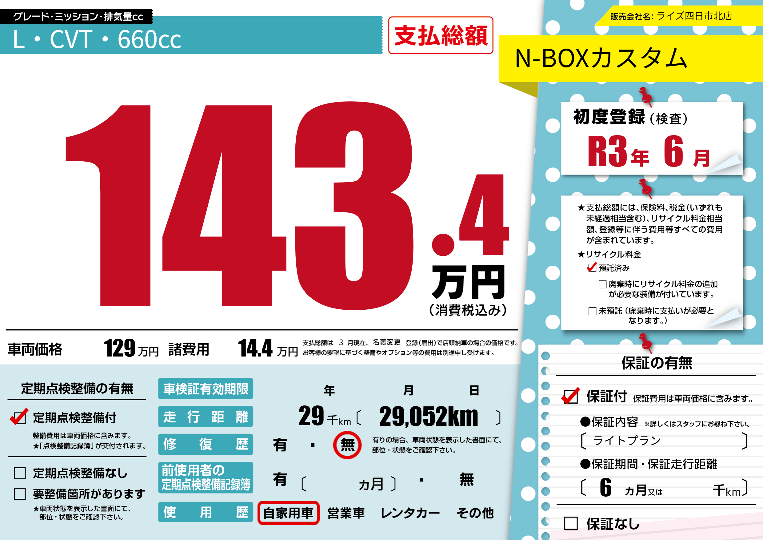 保証付き 保証内容(ライトプラン) 6ヶ月または()千kmまで |