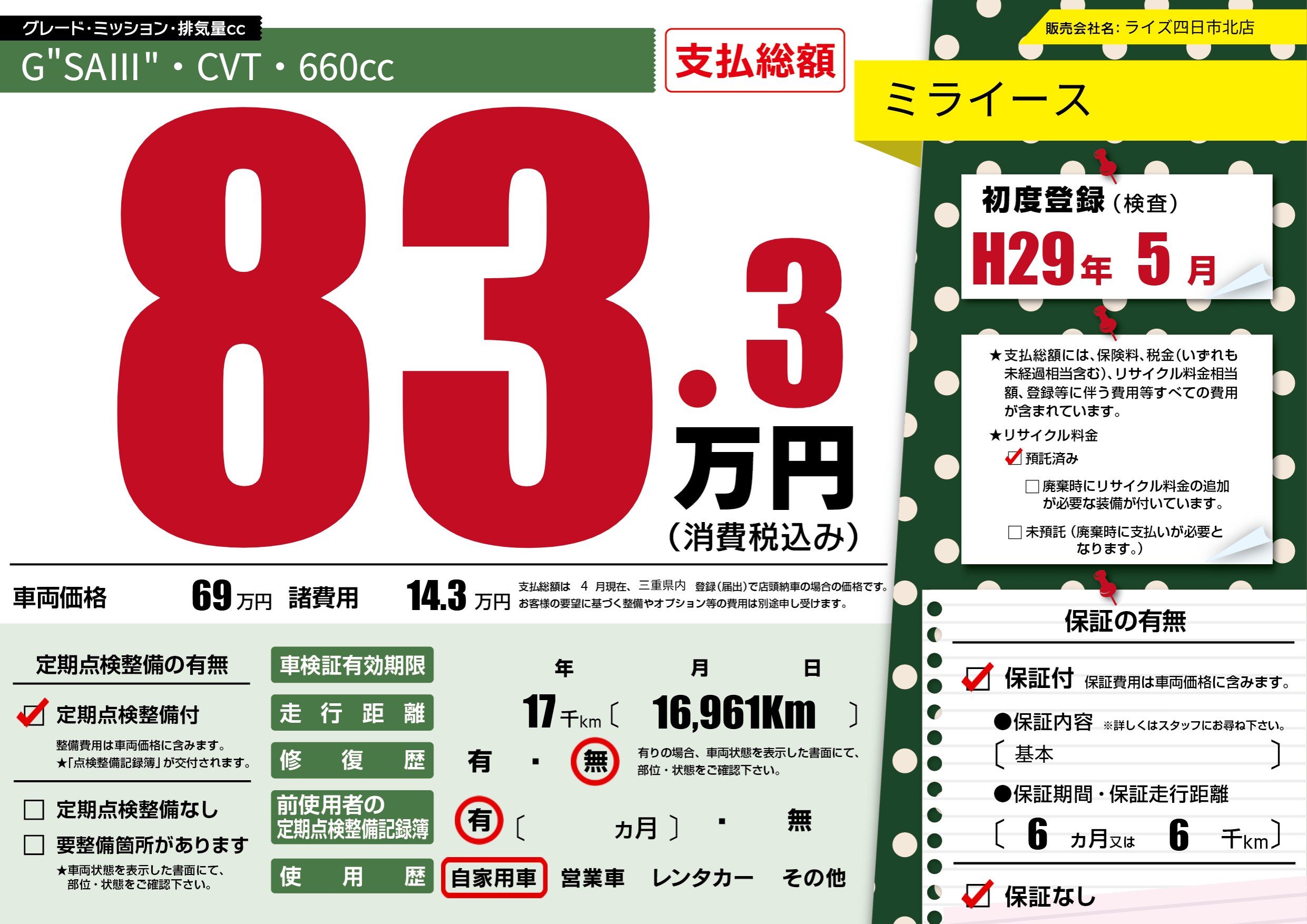 | 車名 | ミライース | グレード ミッション 排気量 |