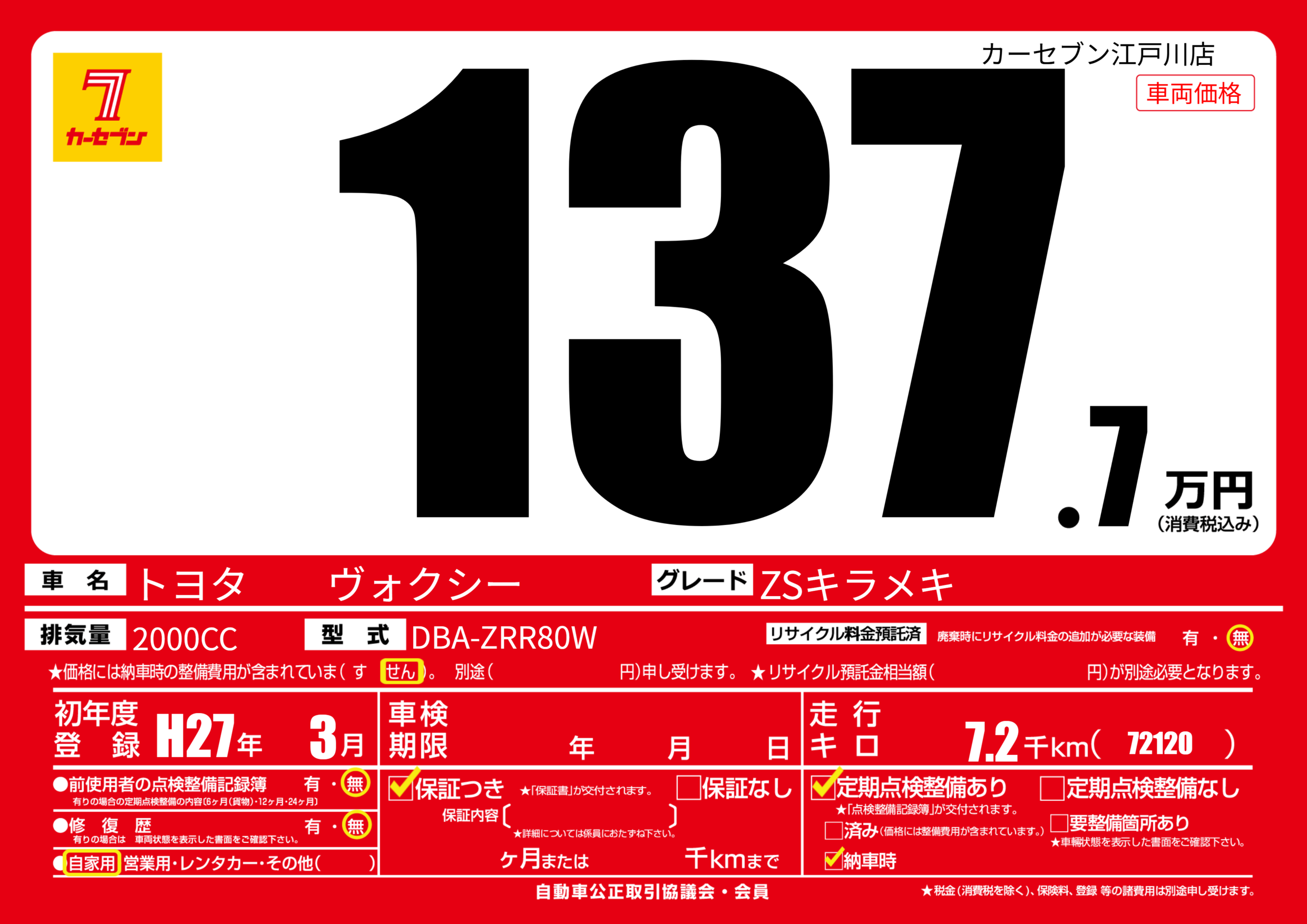 | 車名 | トヨタ ヴォクシー | グレード ミッション 排気量 |
