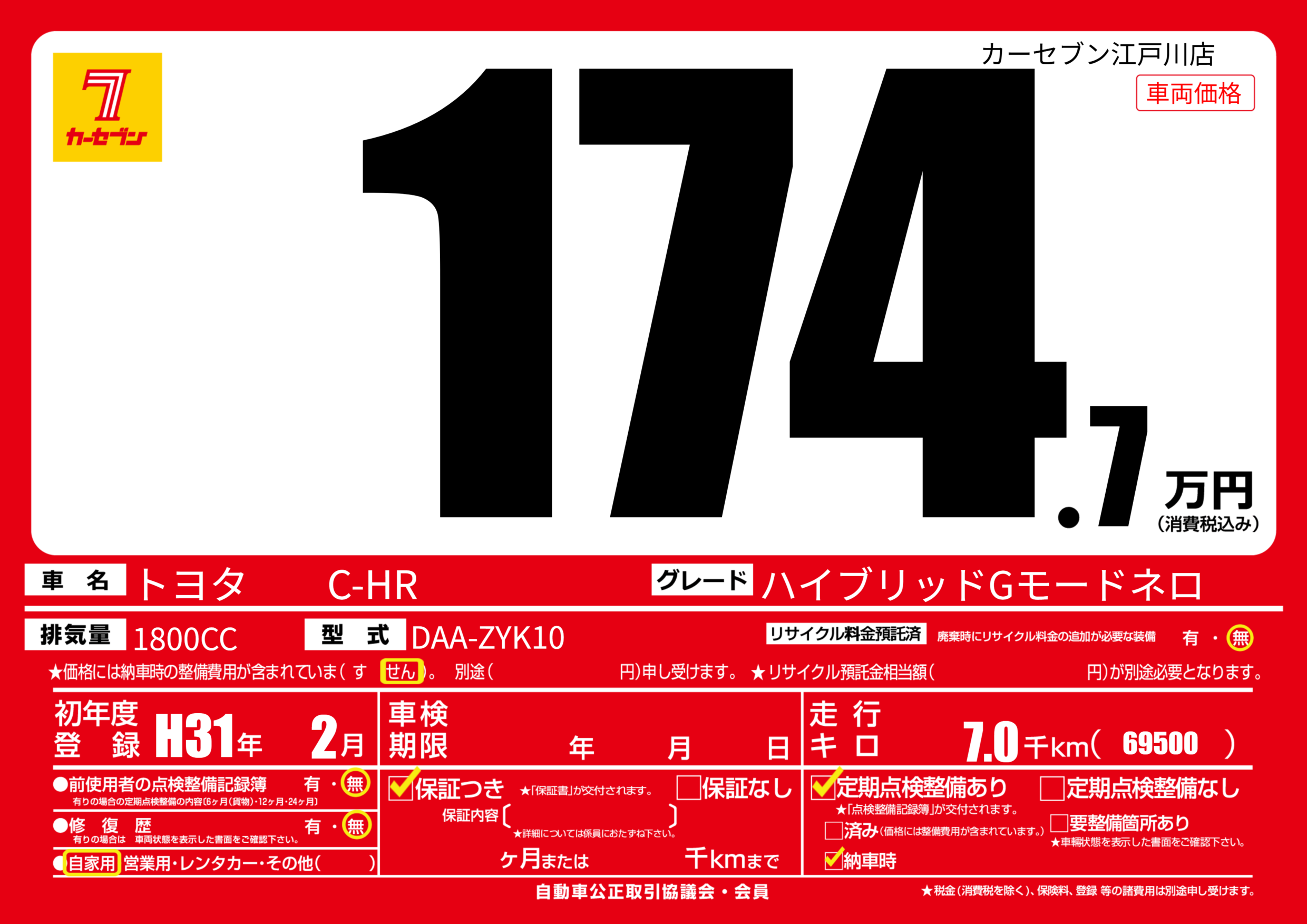 | 車名 | トヨタ C-HR | グレード ミッション 排気量 |