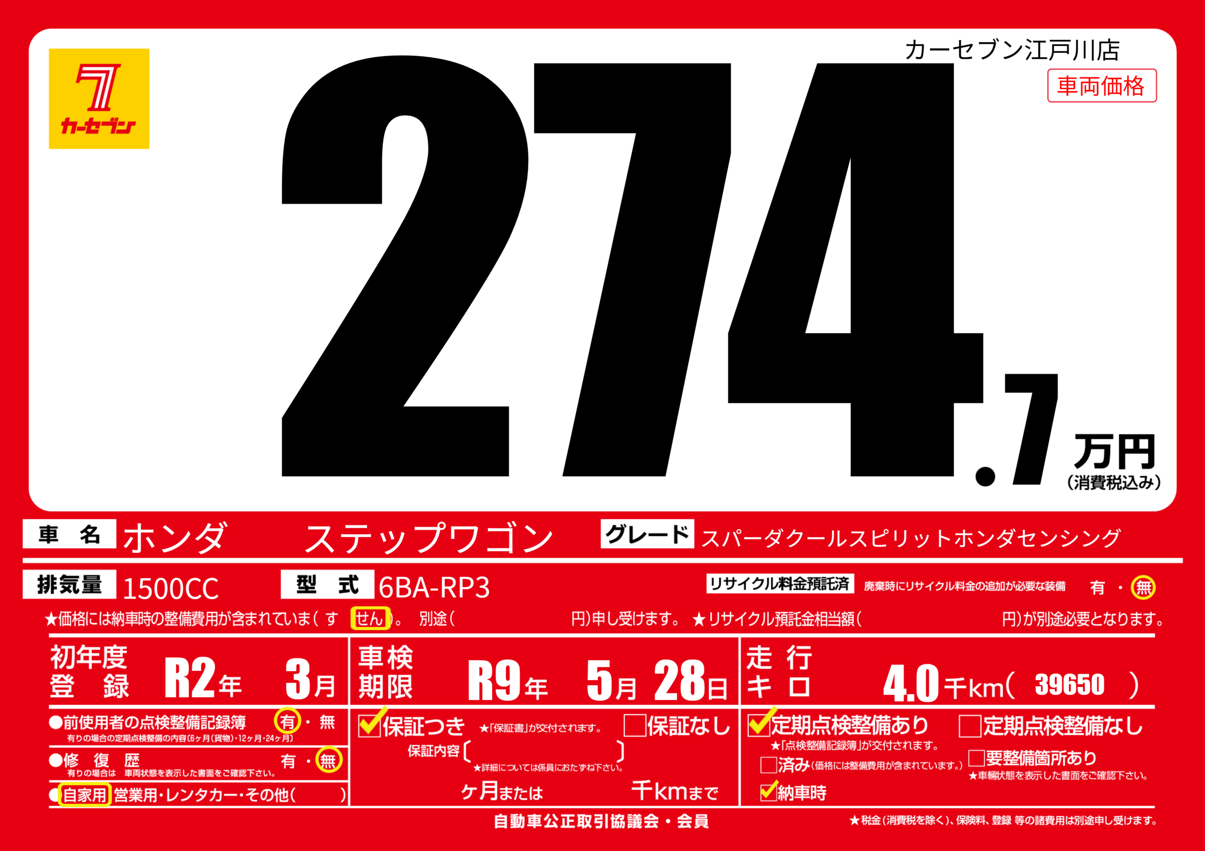 | 車名 | ホンダ ステップワゴン | グレード ミッション 排気量 |