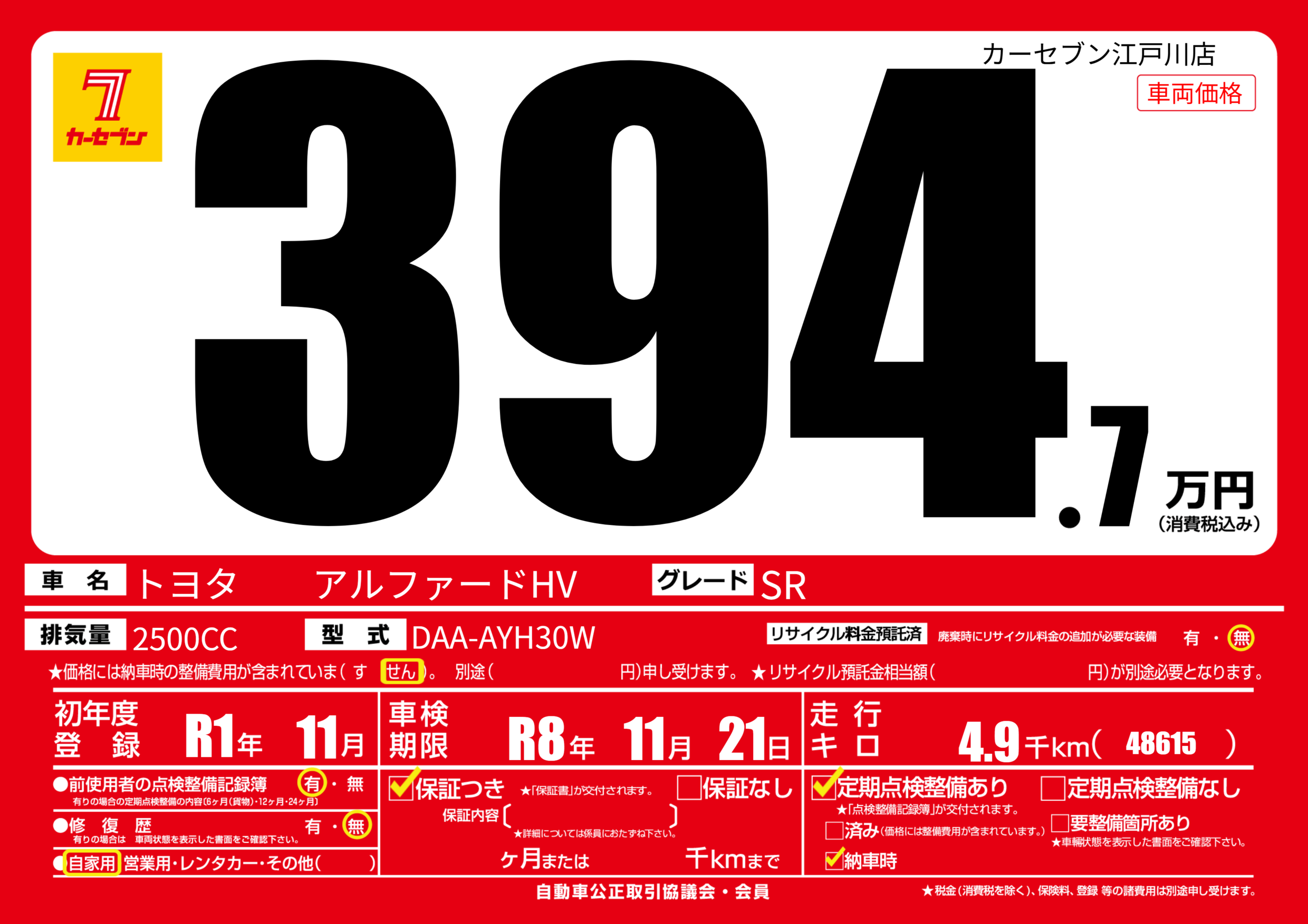 | 車名 | トヨタ アルファードHV | グレード ミッション 排気量 |
