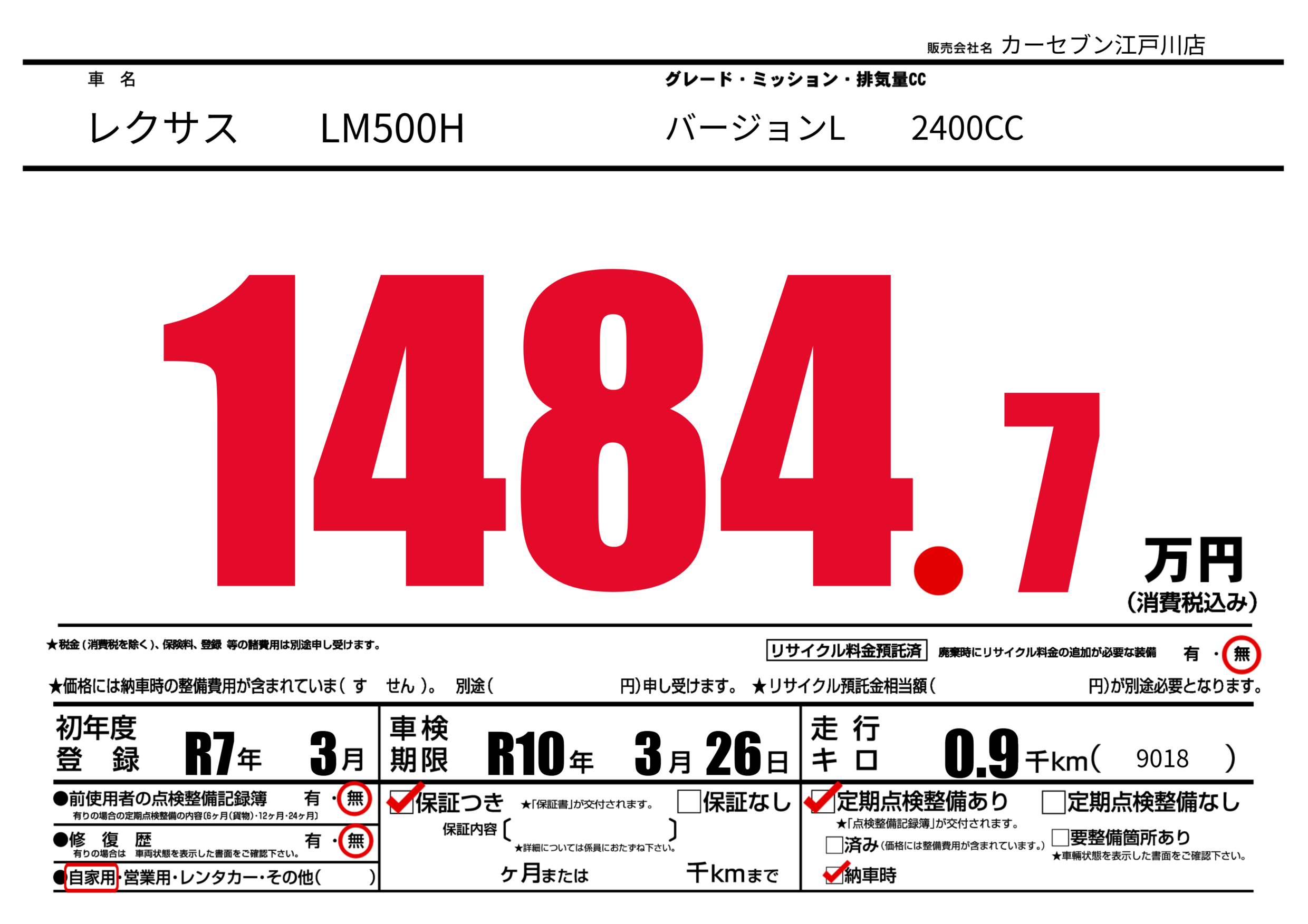 | 車名 | レクサス LM500H | グレード ミッション 排気量 |