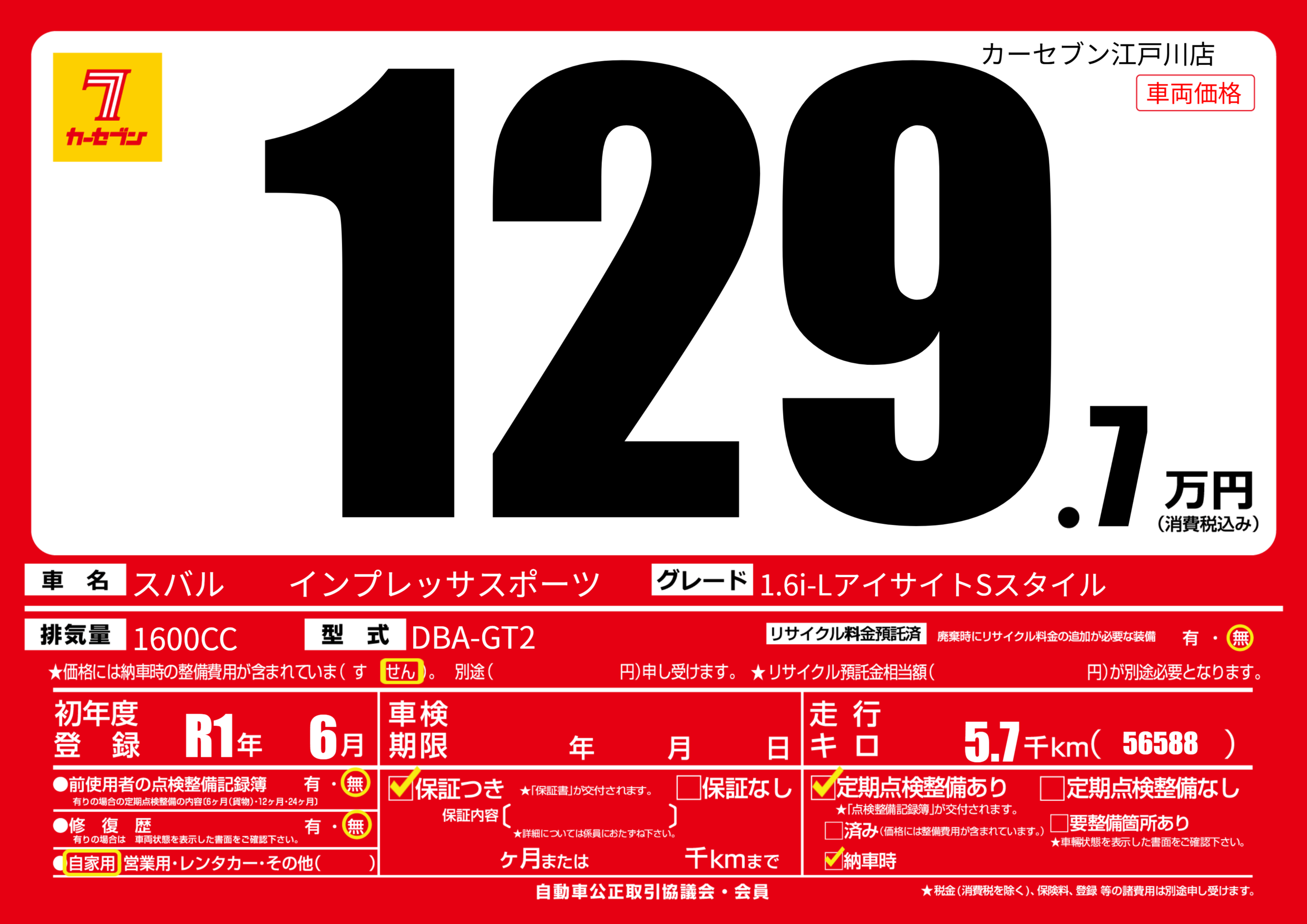 | 車名 | スバル インプレッサスポーツ | グレード ミッション 排気量 |
