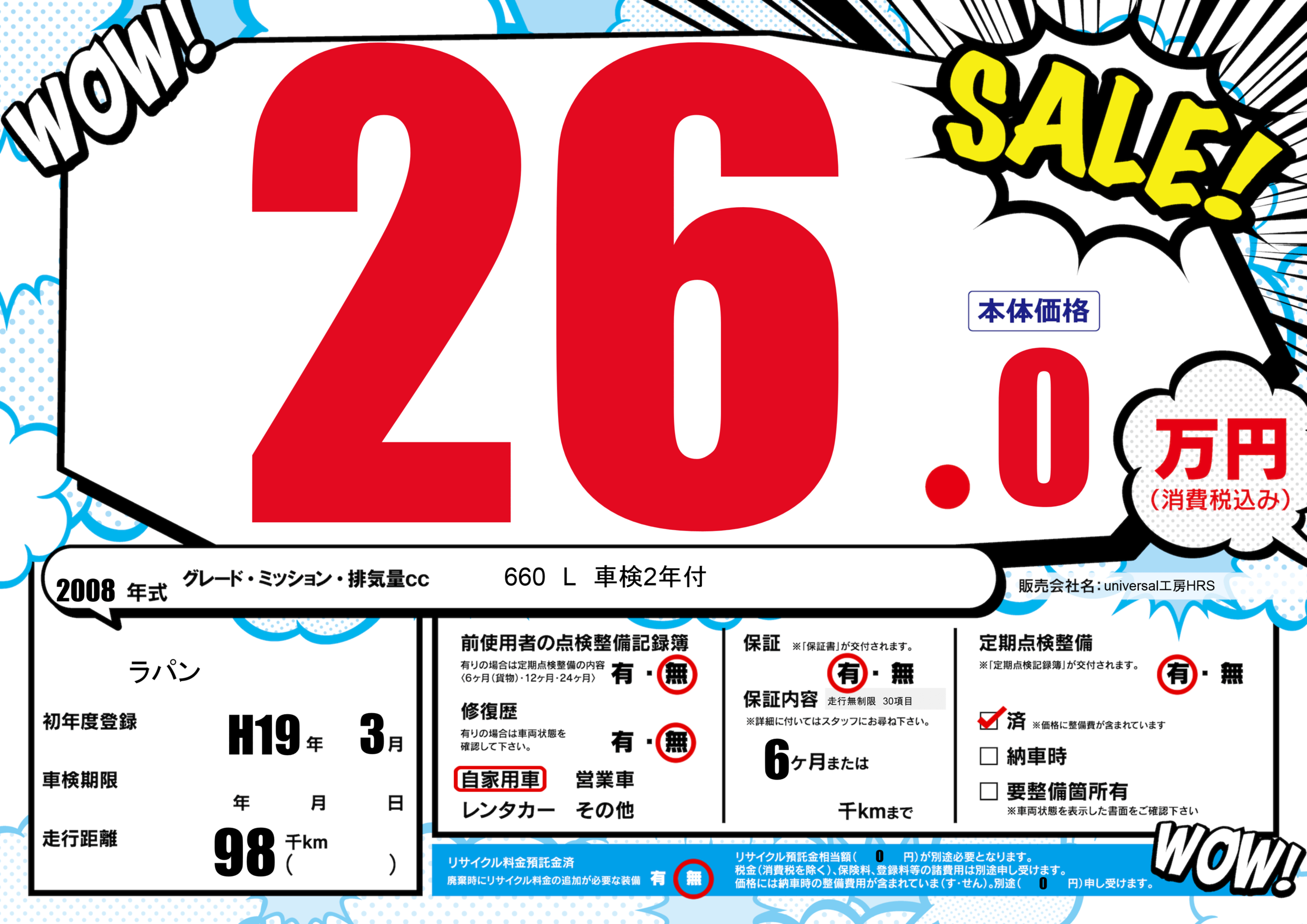 ラパン入庫!車検&6ヶ月保証付き、お支払総額32万円!