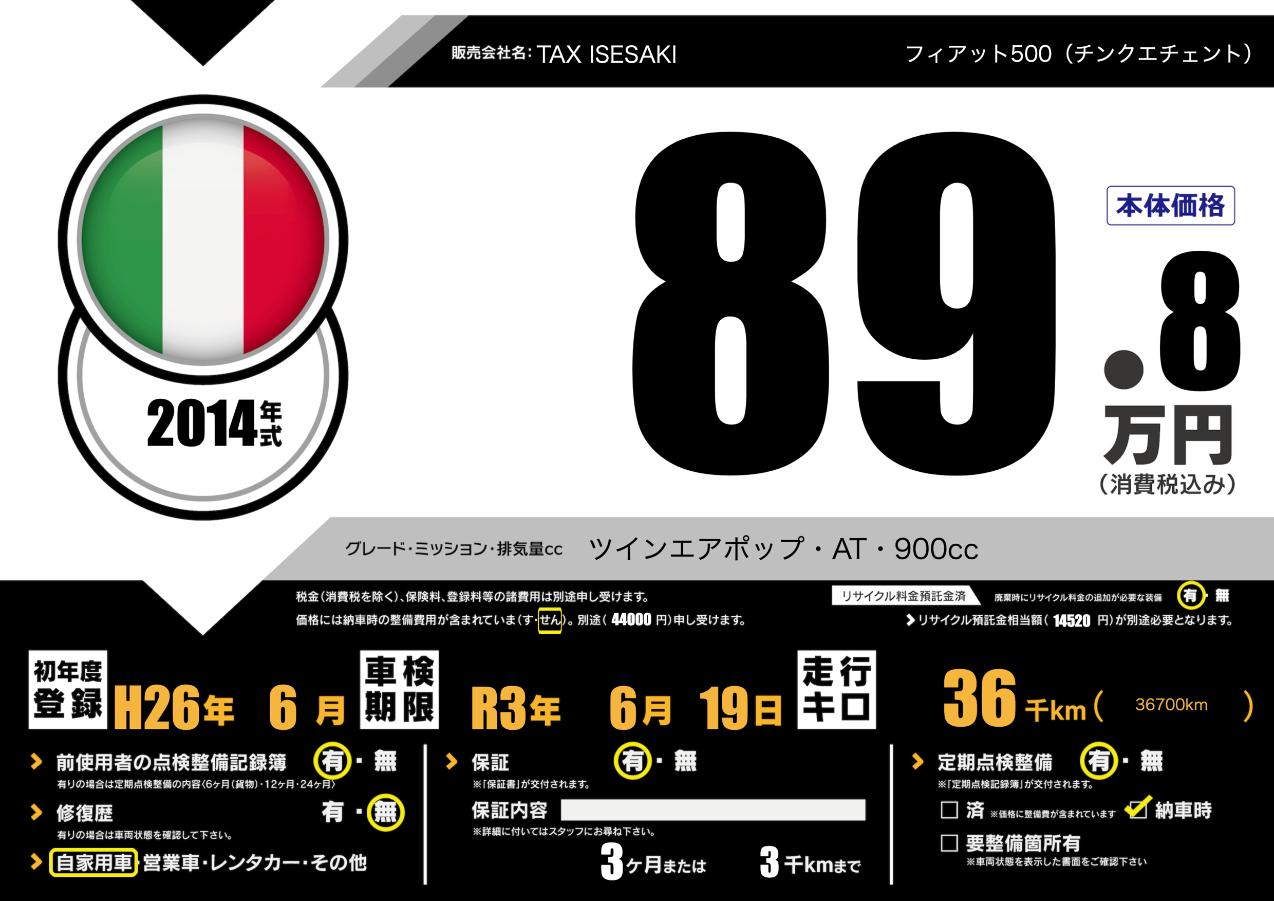 | 車名 | フィアット500(チンクエチェント) | グレード ミッション 排気量 |