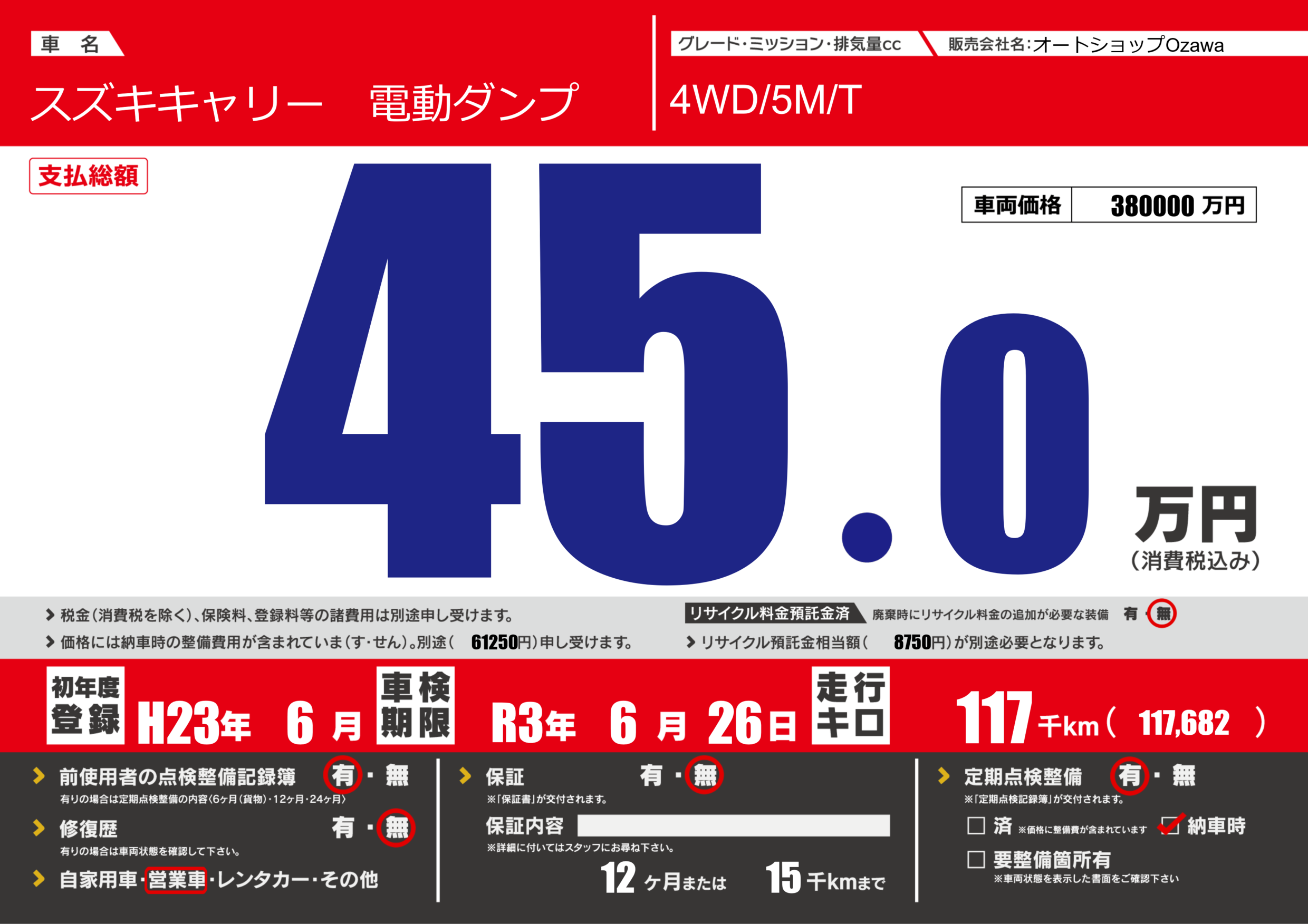 | 車名 | スズキキャリー 電動ダンプ | グレード ミッション 排気量 |