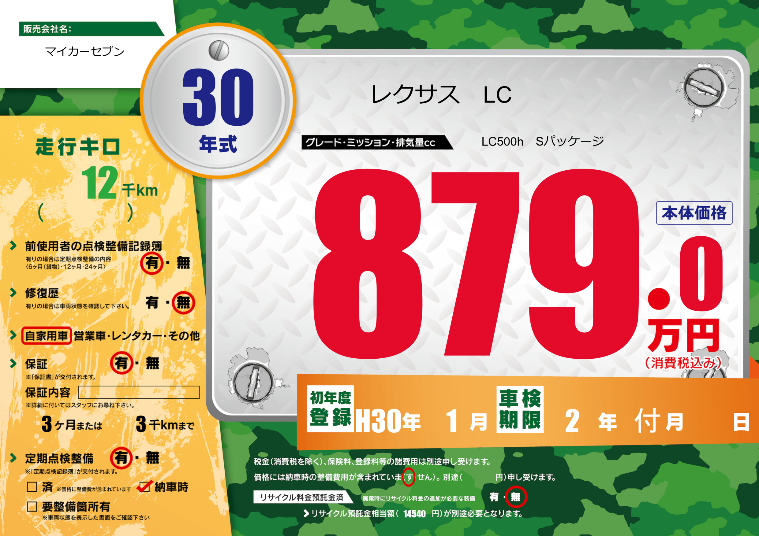 | 車名 | レクサス LC | グレード ミッション 排気量 |