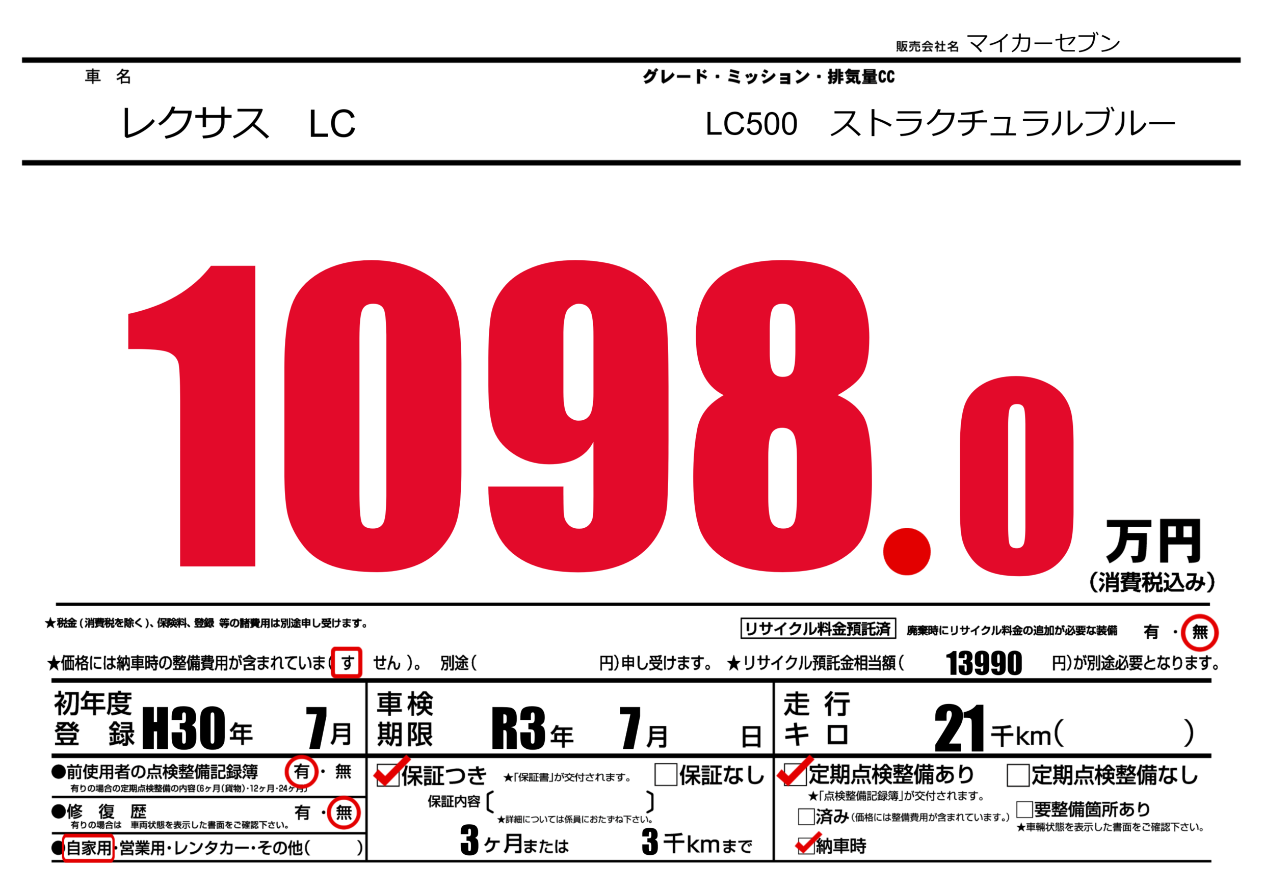| 車名 | レクサス LC | グレード ミッション 排気量 |