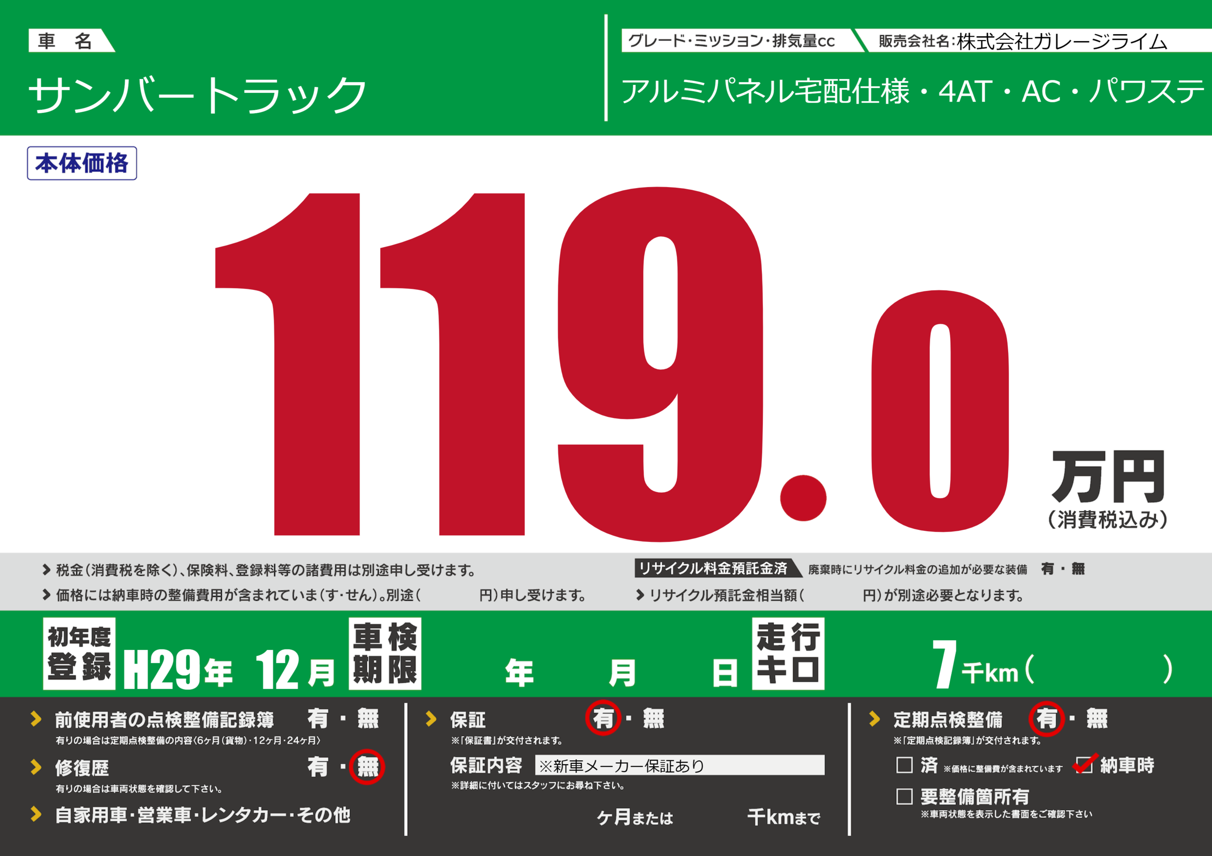 | 車名 | サンバートラック | グレード ミッション 排気量 |