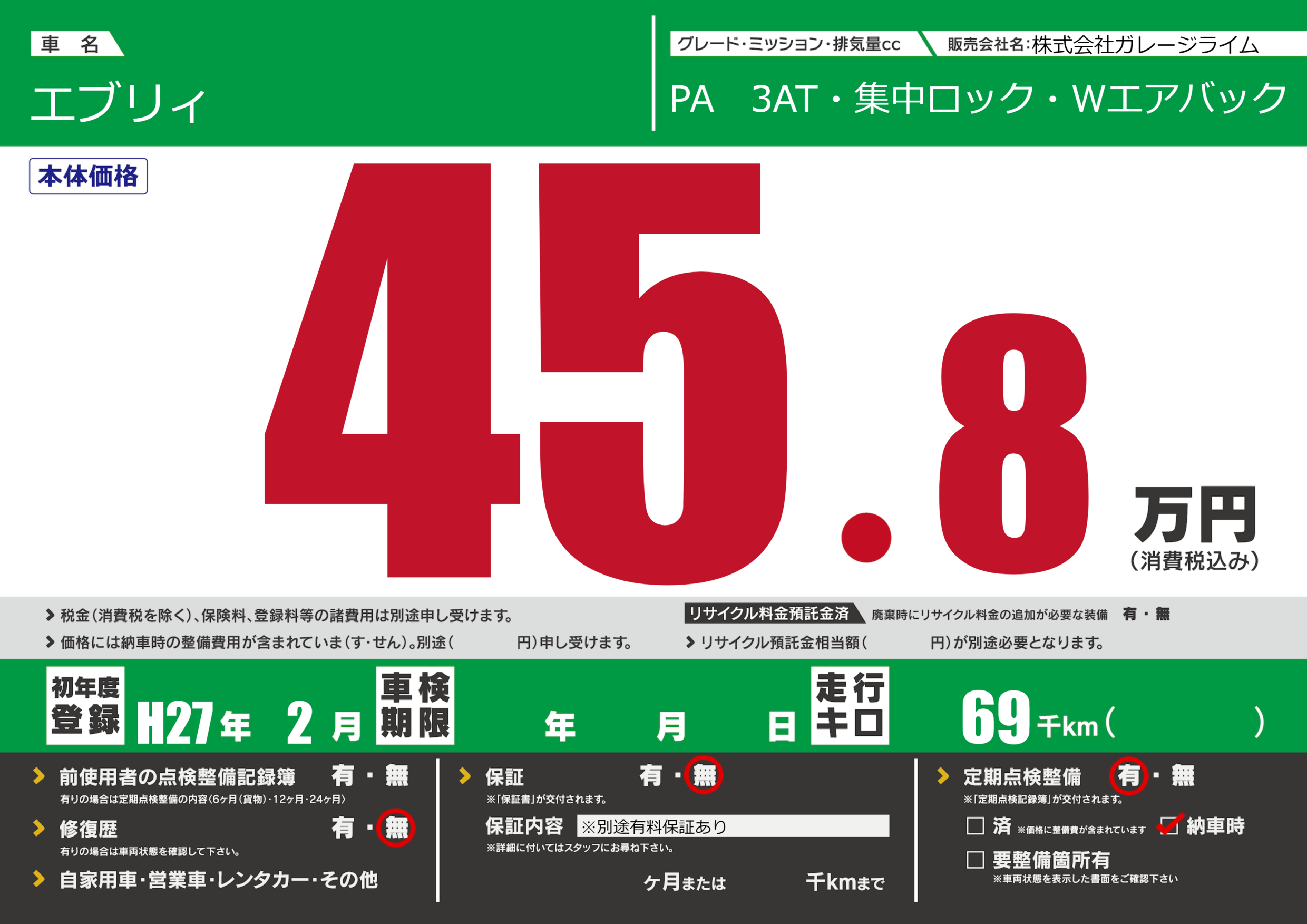 保証なし 保証内容(※別途有料保証あり) ---ヶ月または()千kmまで |