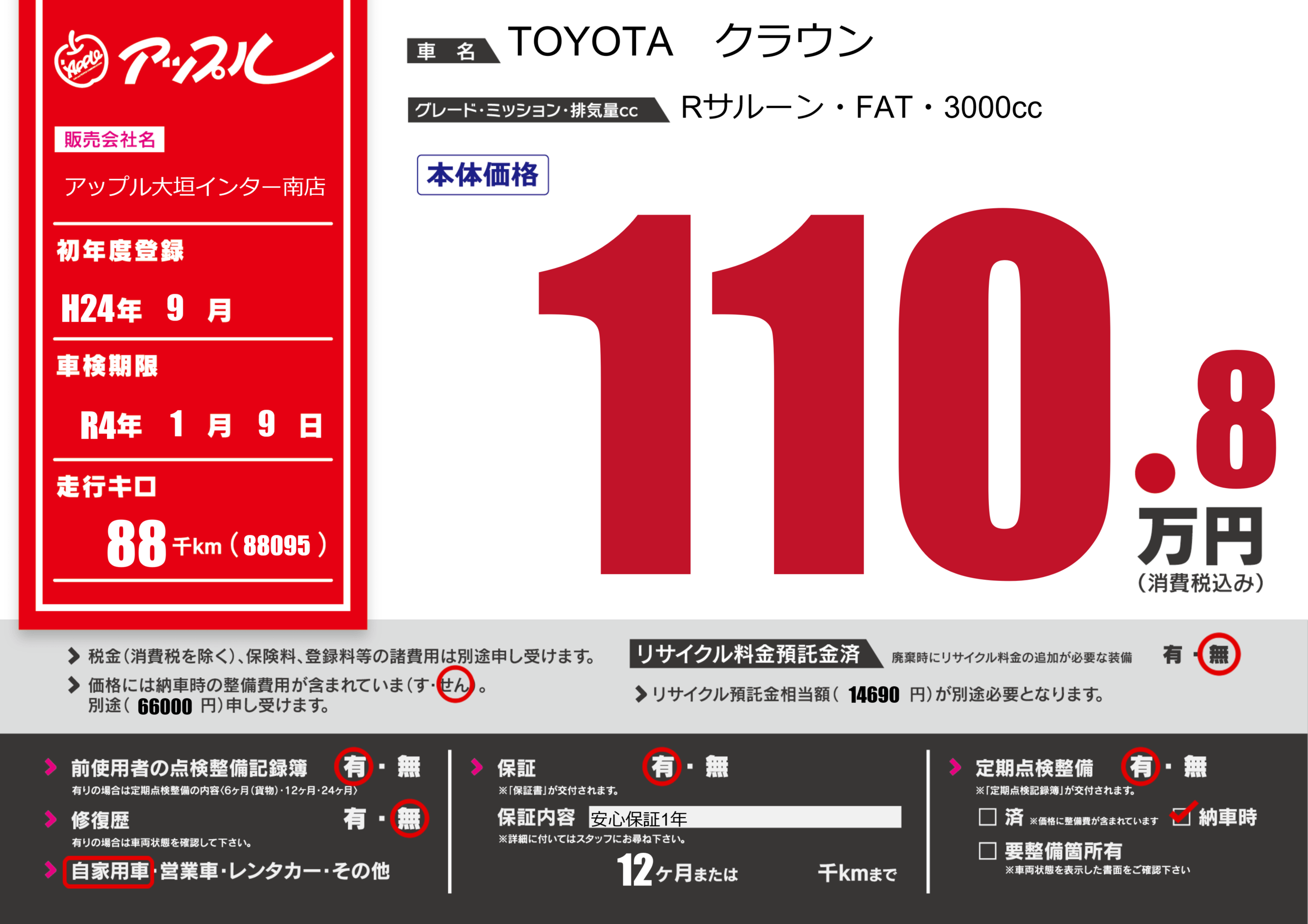 | 車名 | TOYOTA クラウン | グレード ミッション 排気量 |