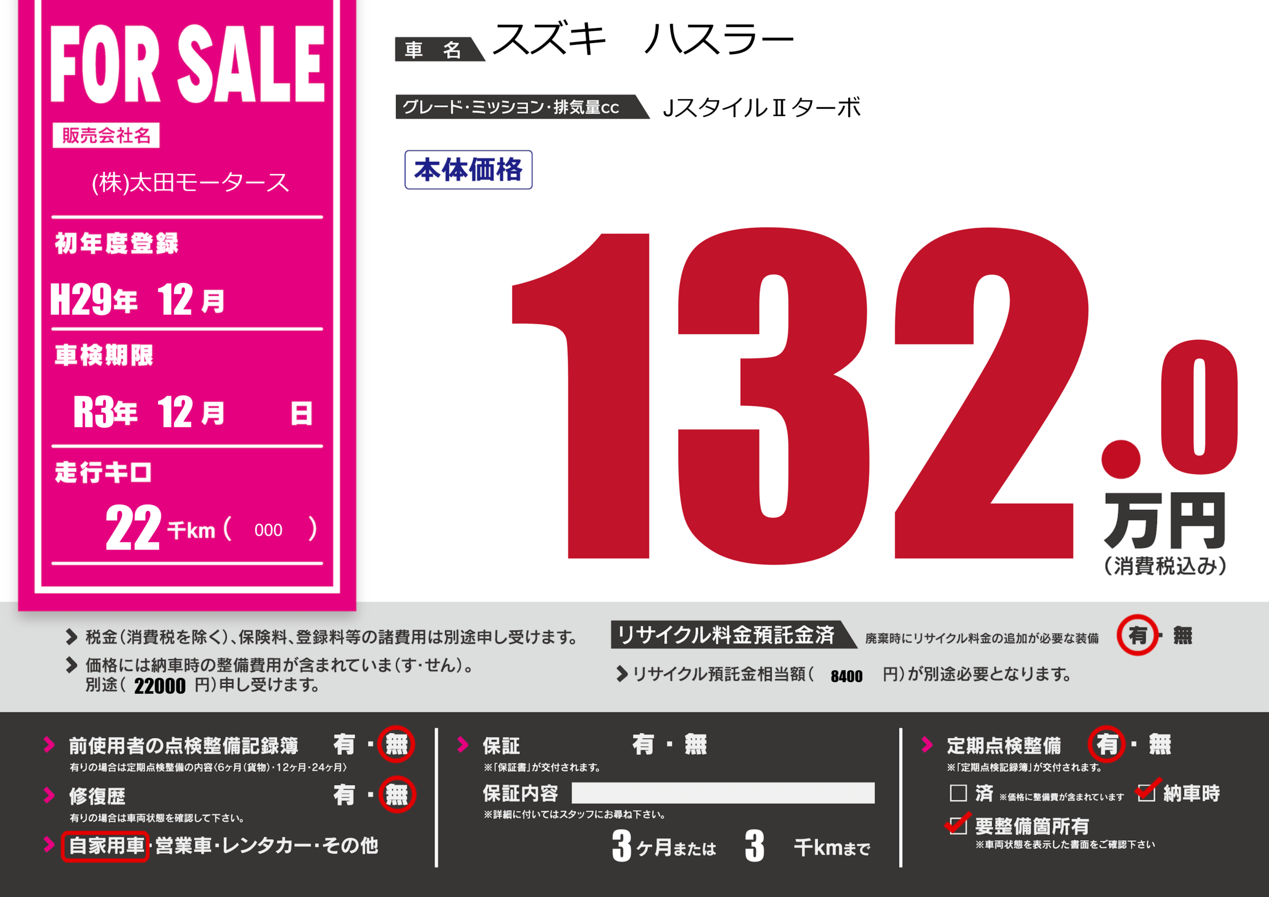 | 車名 | スズキ ハスラー | グレード ミッション 排気量 |