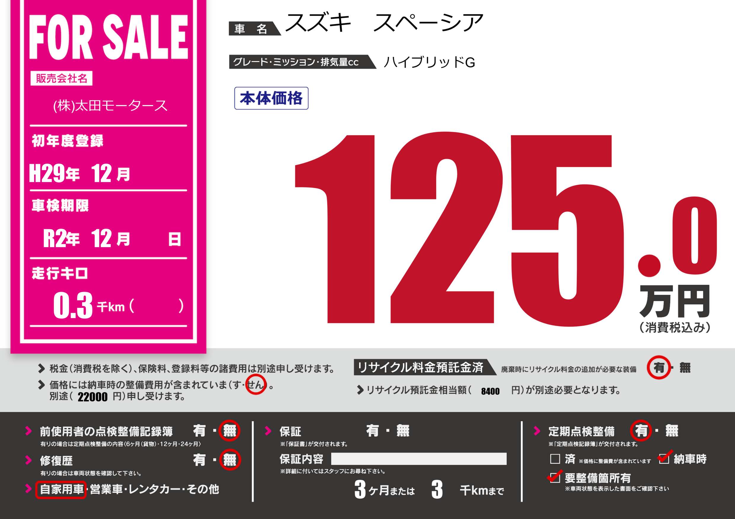 | 車名 | スズキ スペーシア | グレード ミッション 排気量 |