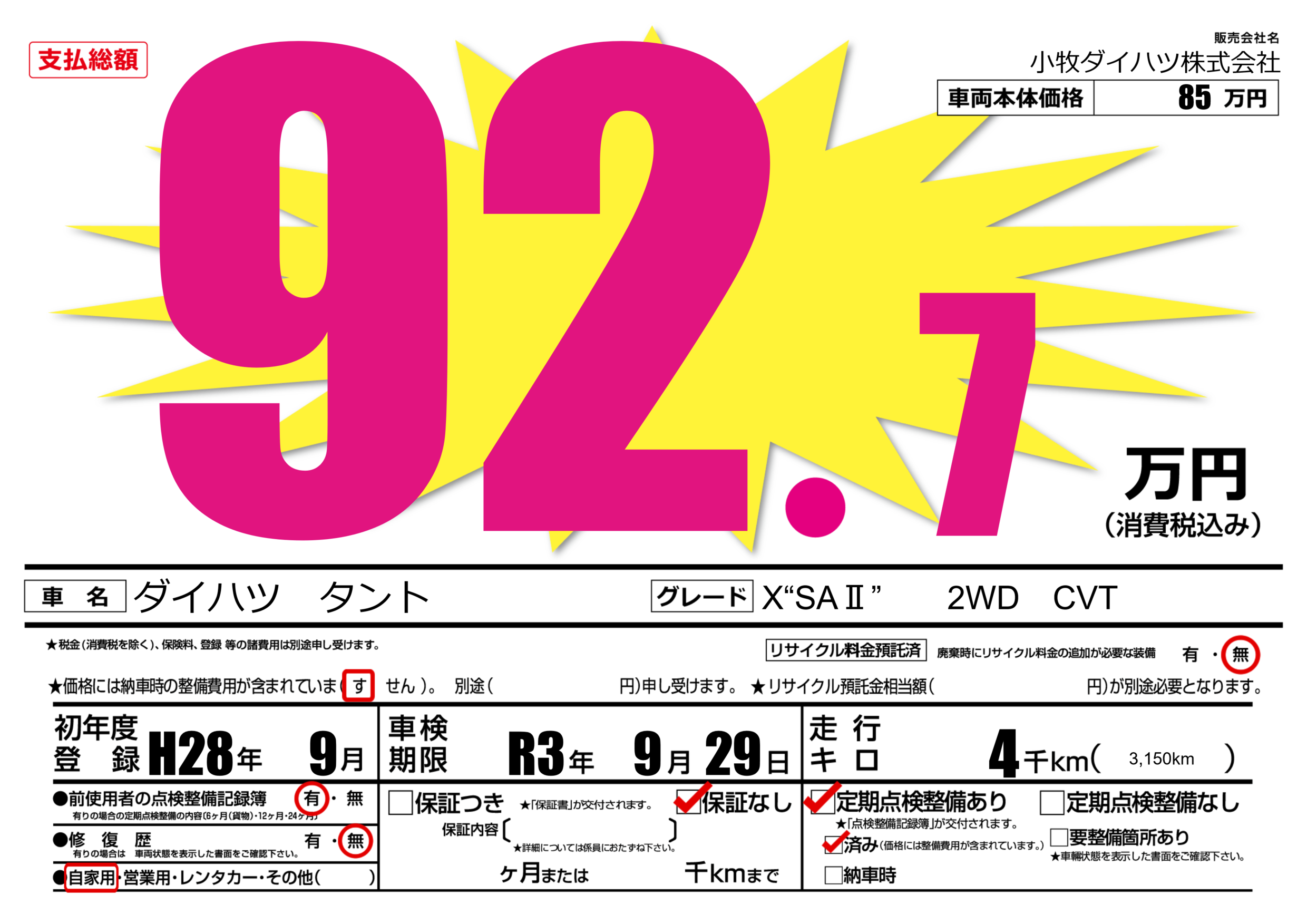 | 定期点検整備 | 定期点検整備あり 定期点検整備済み | ||