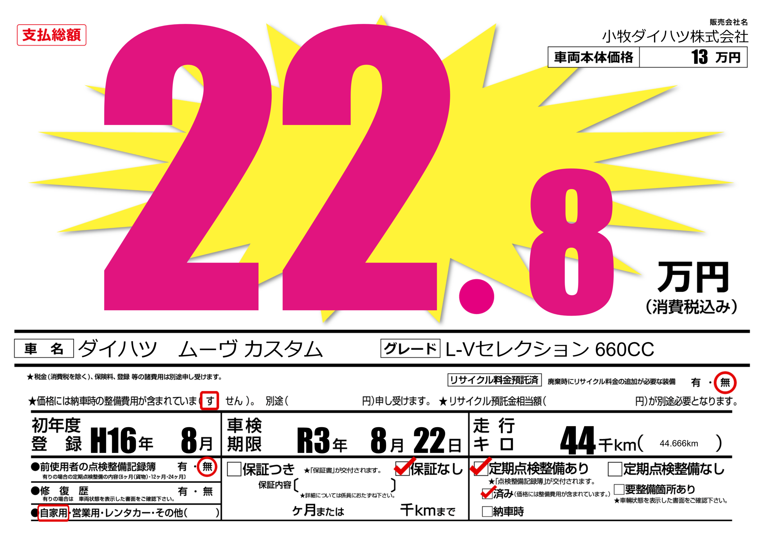 | 定期点検整備 | 定期点検整備あり 定期点検整備済み | ||