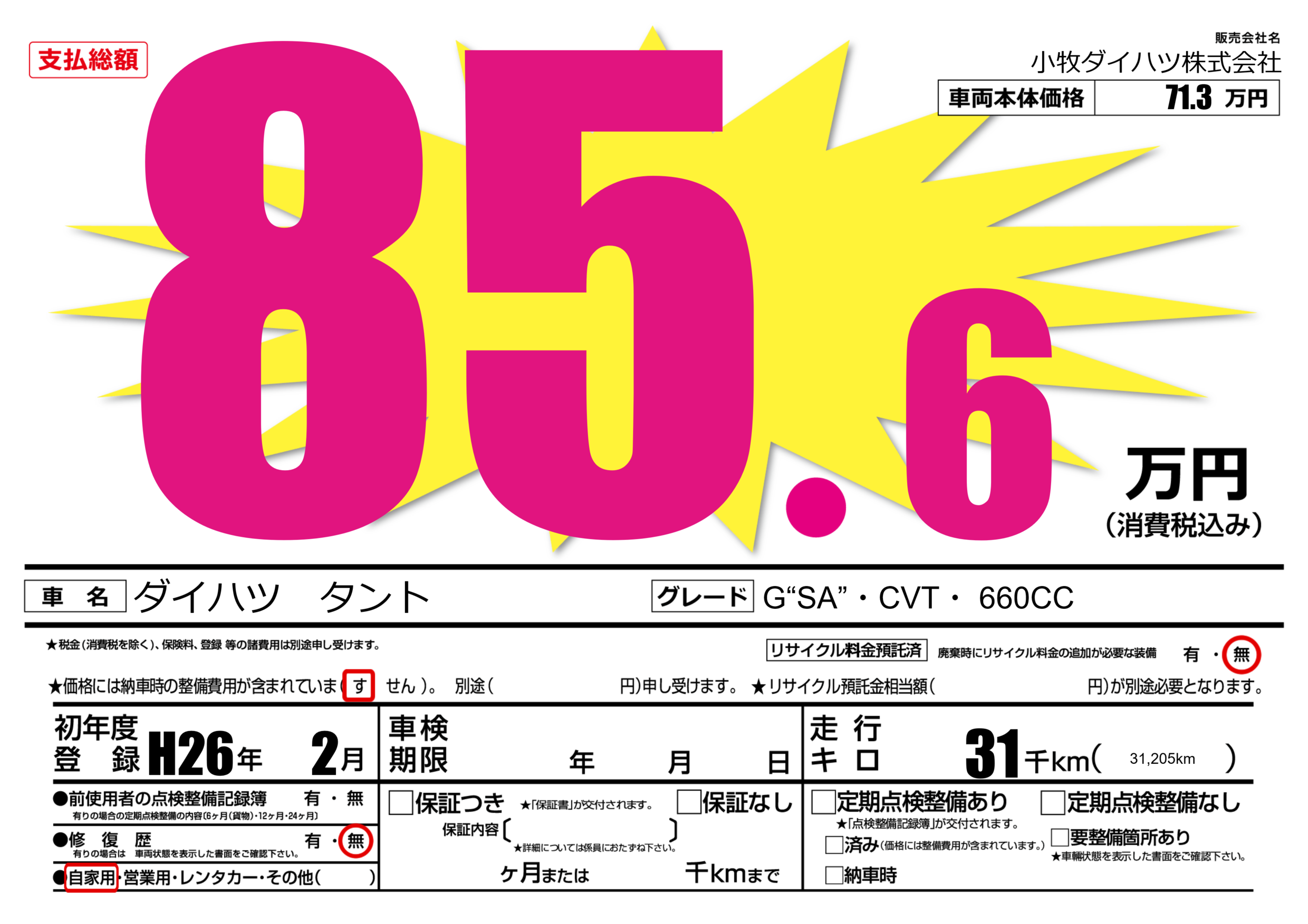 | 走行キロ | 3.1万km | 初年度登録 | H26年2月 |
