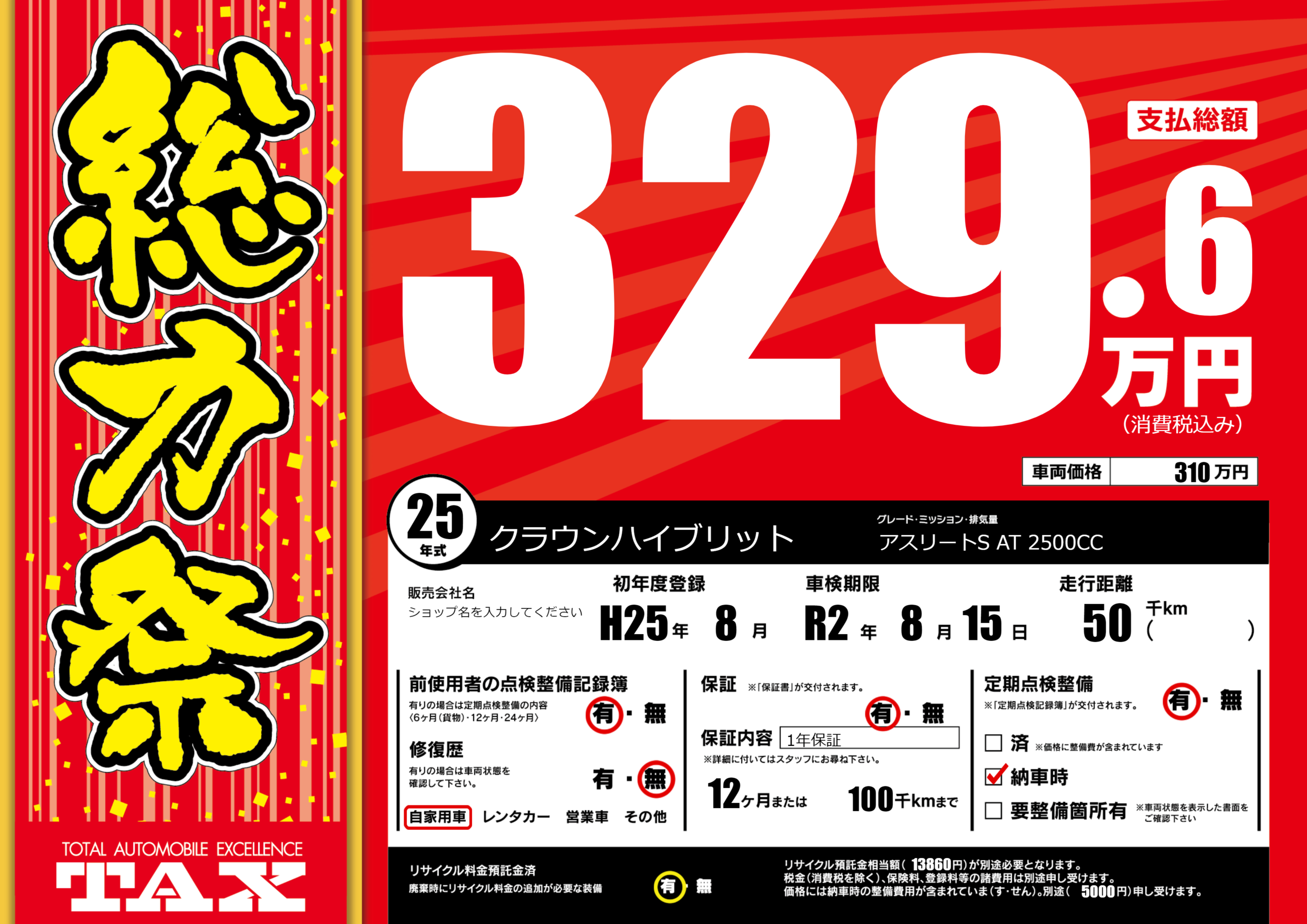 | 走行キロ | 5万km | 初年度登録 | H25年8月 |