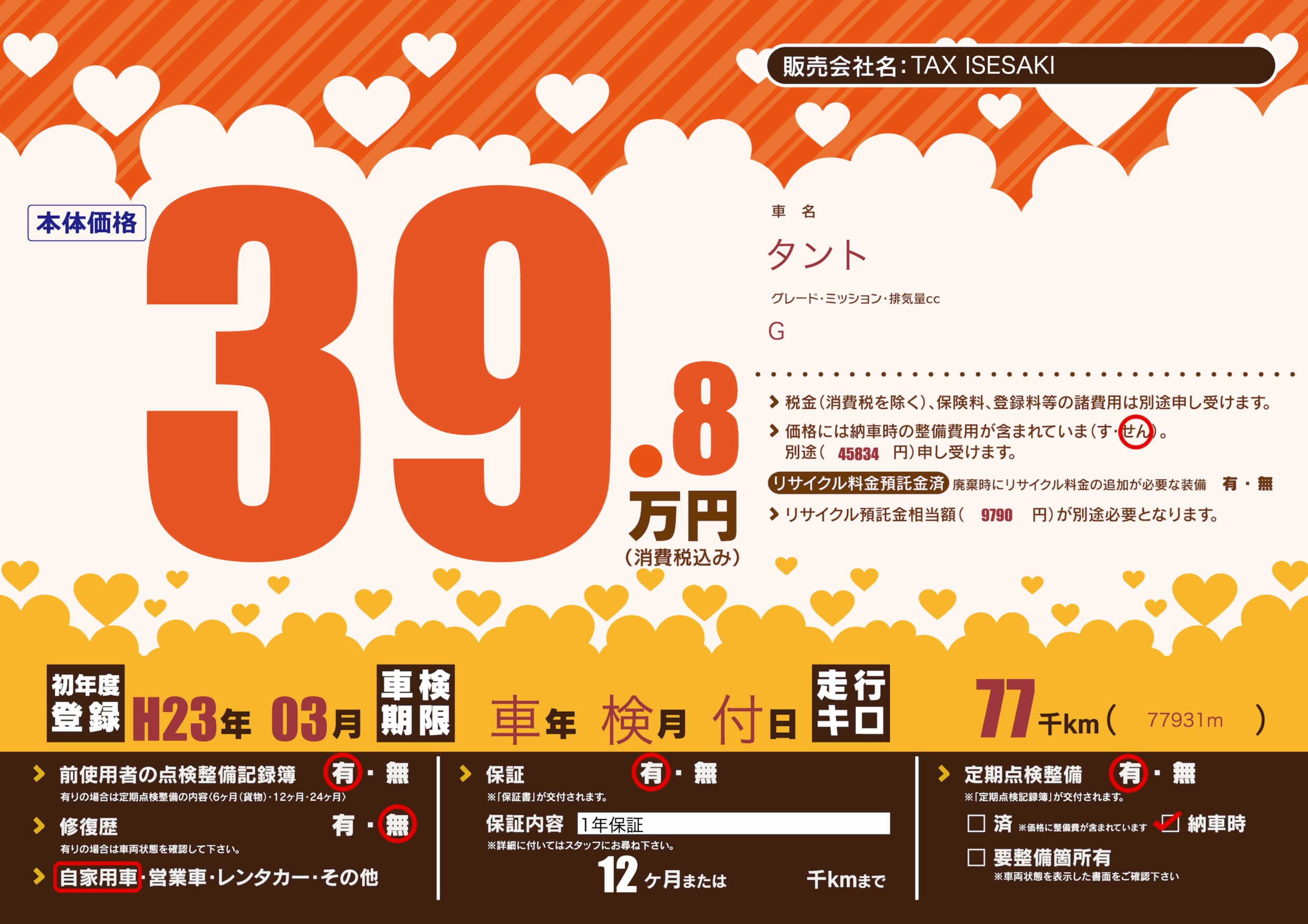 | 車名 | タント | グレード ミッション 排気量 |