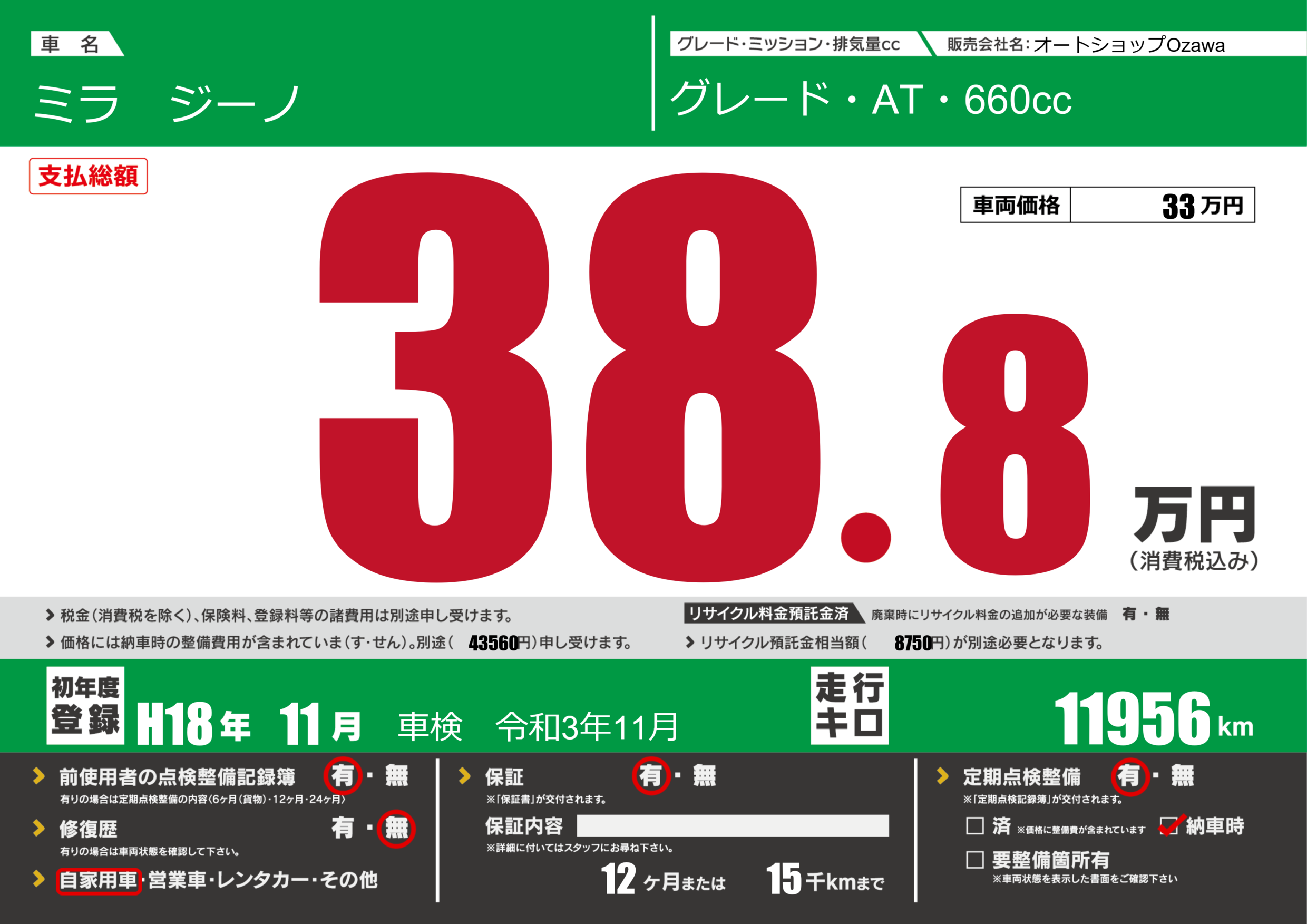 保証付き 保証内容(---) 12ヶ月または(15)千kmまで |