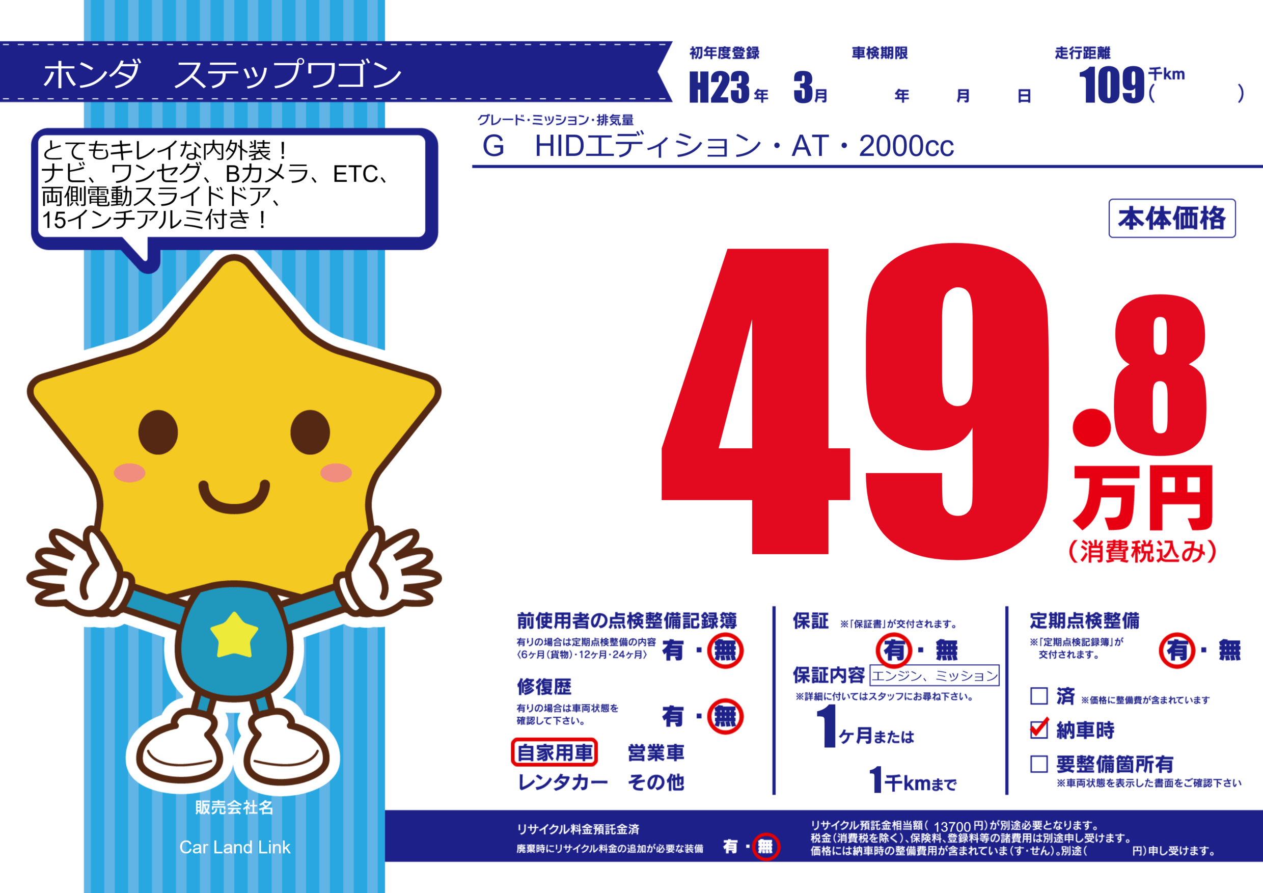 | 走行キロ | 10.9万km | 初年度登録 | H23年3月 |