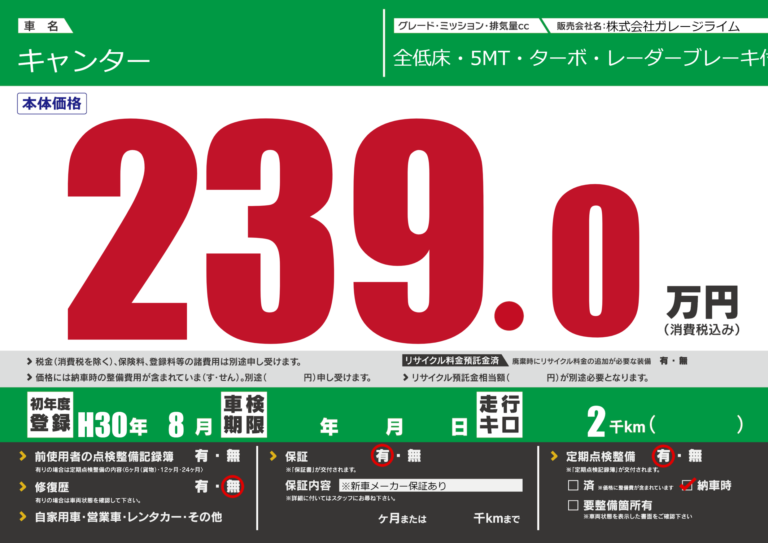 | 走行キロ | 0.2万km | 初年度登録 | H30年8月 |