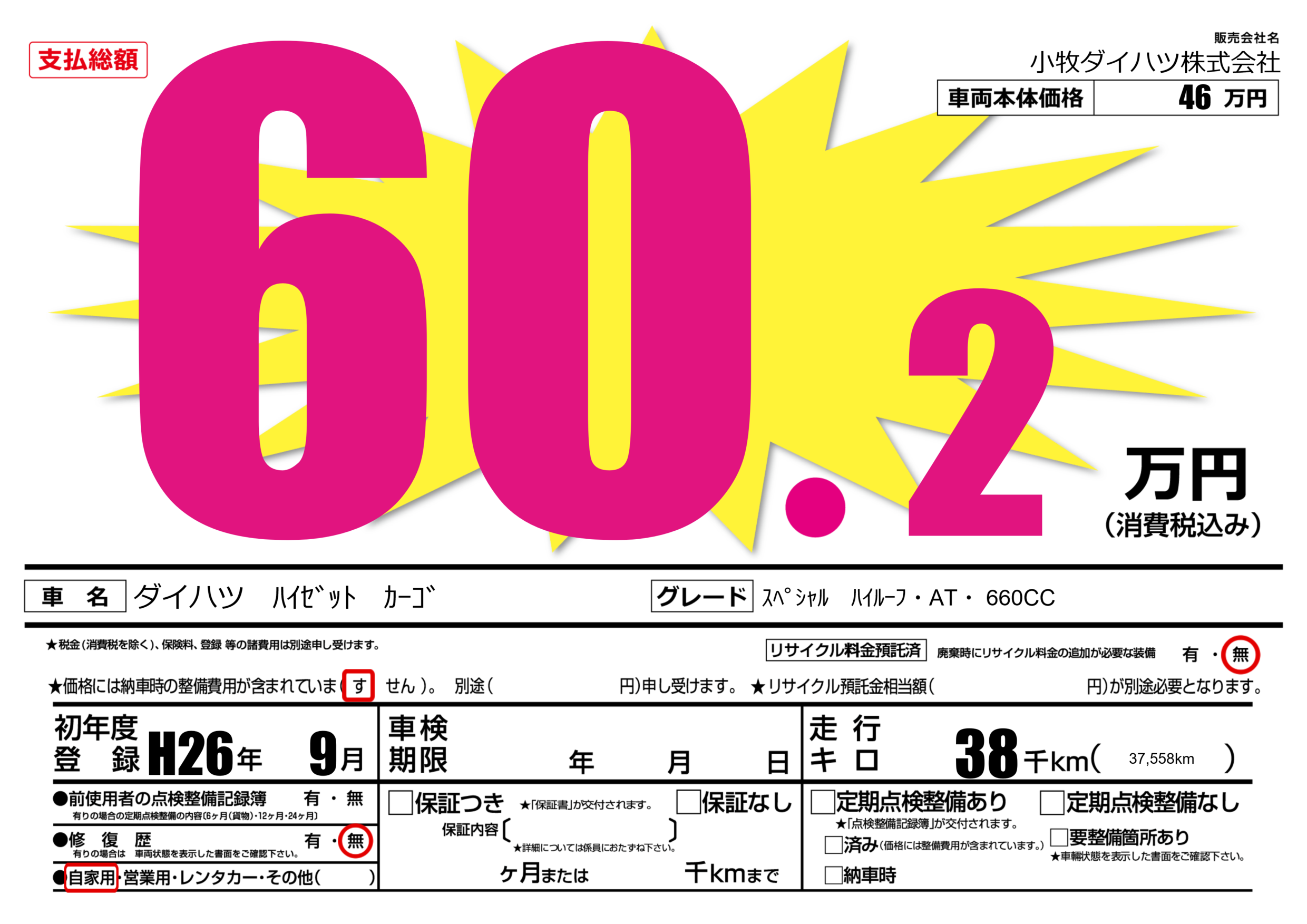 | 車名 | ダイハツ ハイゼット カーゴ | グレード ミッション 排気量 |