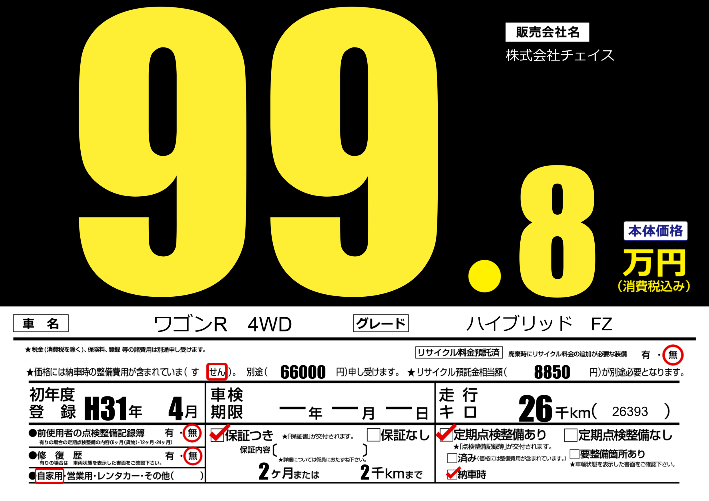 | 車名 | ワゴンR 4WD | グレード ミッション 排気量 |
