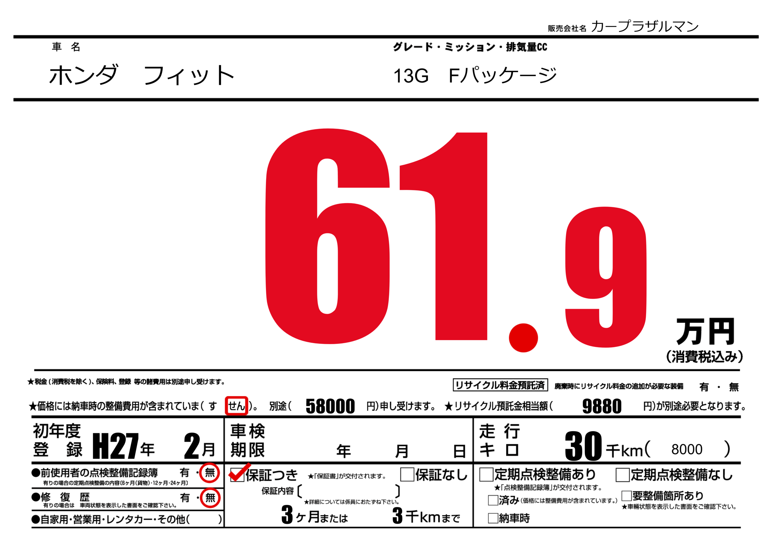 | 走行キロ | 3万km | 初年度登録 | H27年2月 |